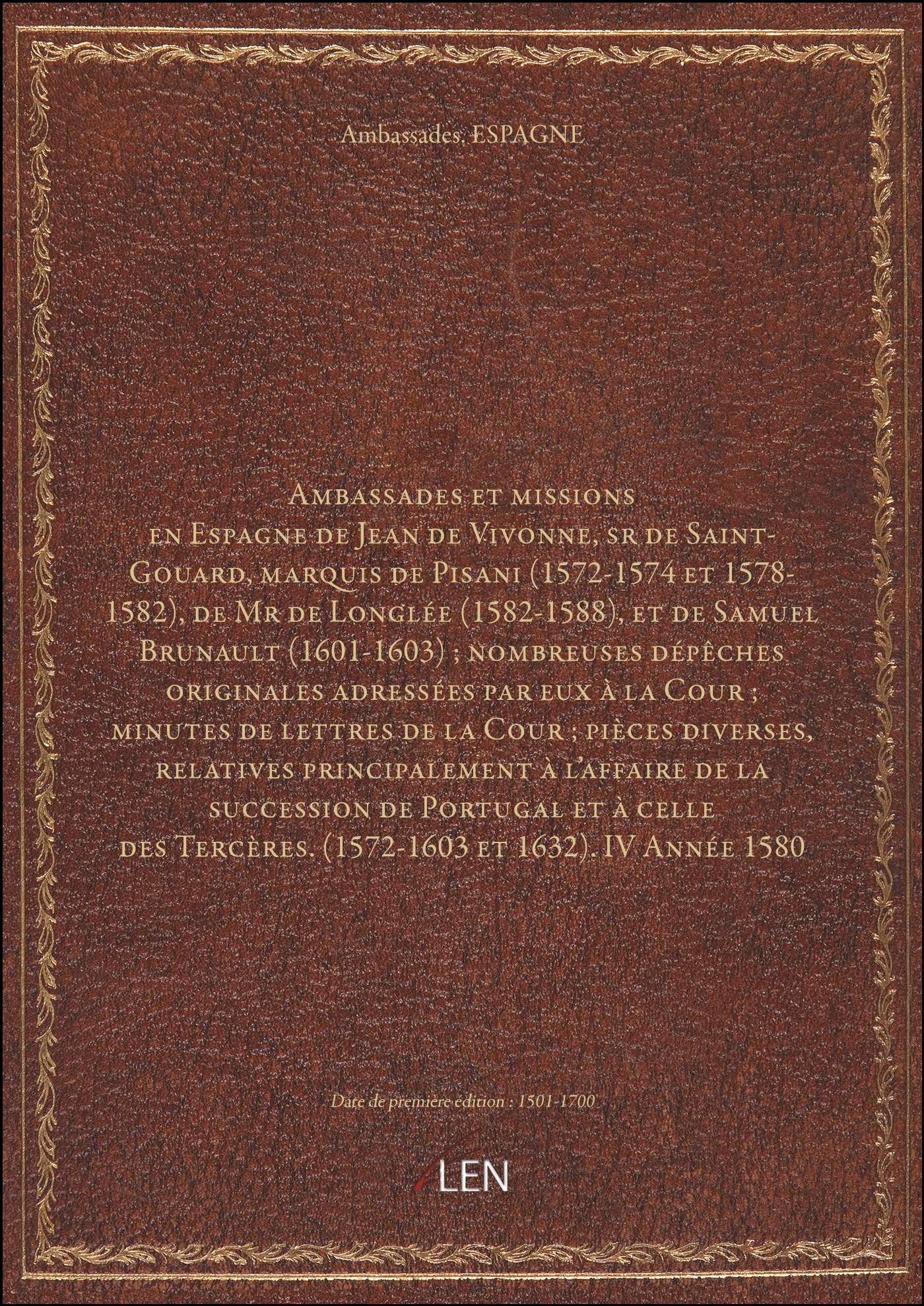 Titre complet : Ambassades et missions en Espagne de Jean de Vivonne, sr de Saint-Gouard, marquis de Pisani (1572-1574 et 1578-1582), de Mr de Longlée (1582-1588), et de Samuel Brunault (1601-1603) ; nombreuses dépêches originales adressées par eux à la Cour ; minutes de lettres de la Cour ; pièces diverses, relatives principalement à l'affaire de la succession de Portugal et à celle des Tercères. (1572-1603 et 1632). IV Année 1580