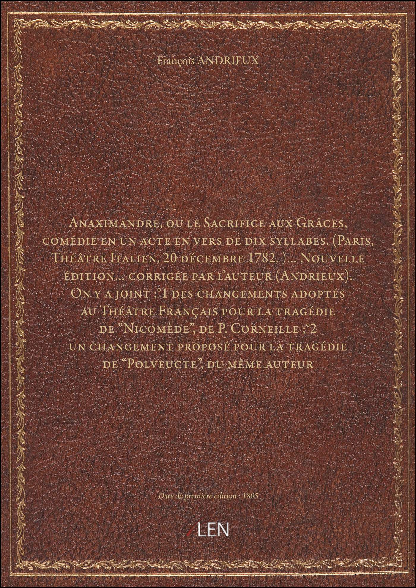 Titre complet : Anaximandre, ou le Sacrifice aux Grâces, comédie en un acte en vers de dix syllabes. (Paris, Théâtre Italien, 20 décembre 1782.)... Nouvelle édition... corrigée par l'auteur (Andrieux). On y a joint :°1 des changements adoptés au Théâtre Français pour la tragédie de "Nicomède", de P. Corneille ;°2 un changement proposé pour la tragédie de "Polveucte", du même auteur