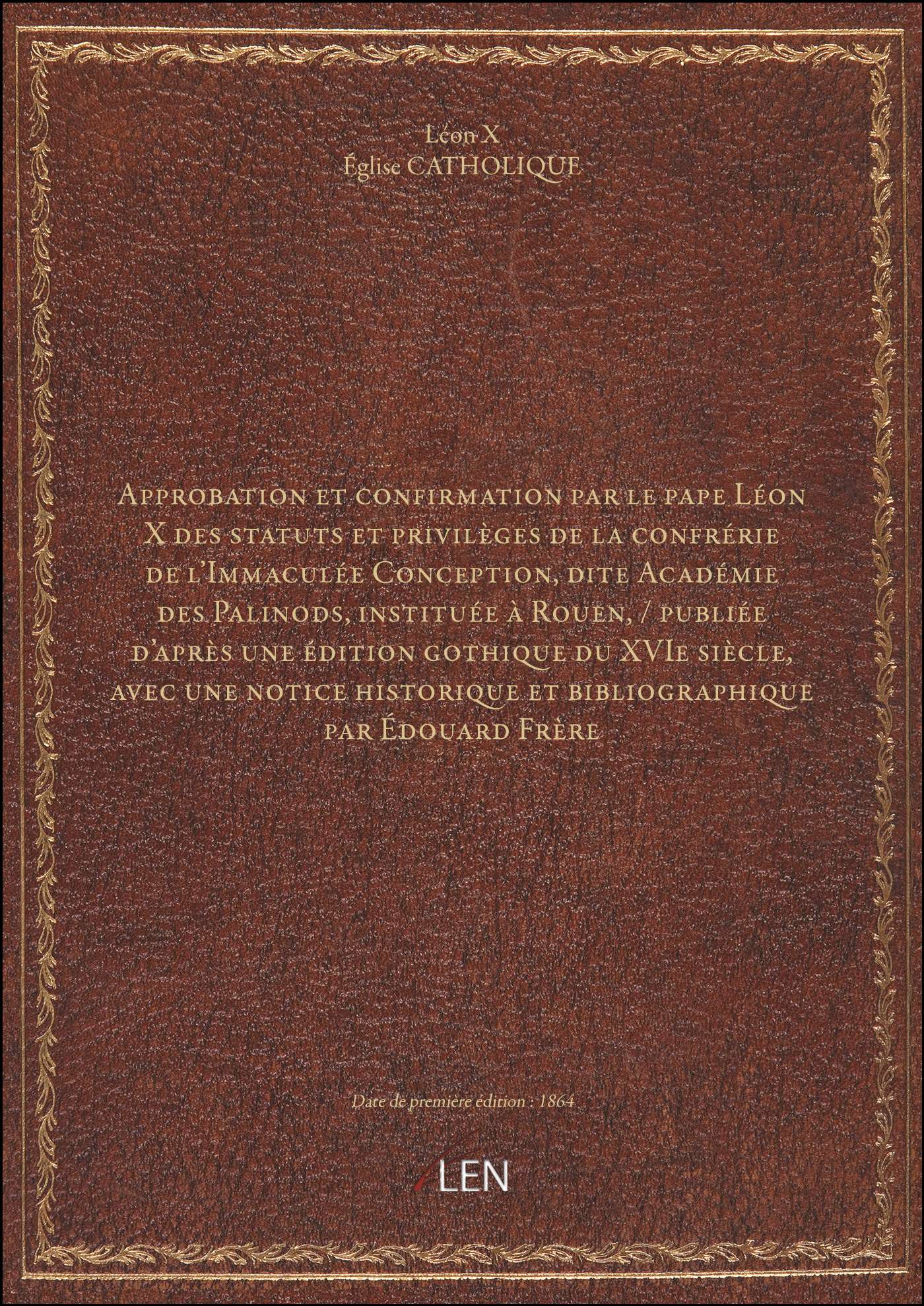 Titre complet : Approbation et confirmation par le pape Léon X des statuts et privilèges de la confrérie de l'Immaculée Conception, dite Académie des Palinods, instituée à Rouen, / publiée d'après une édition gothique du XVIe siècle, avec une notice historique et bibliographique par Édouard Frère