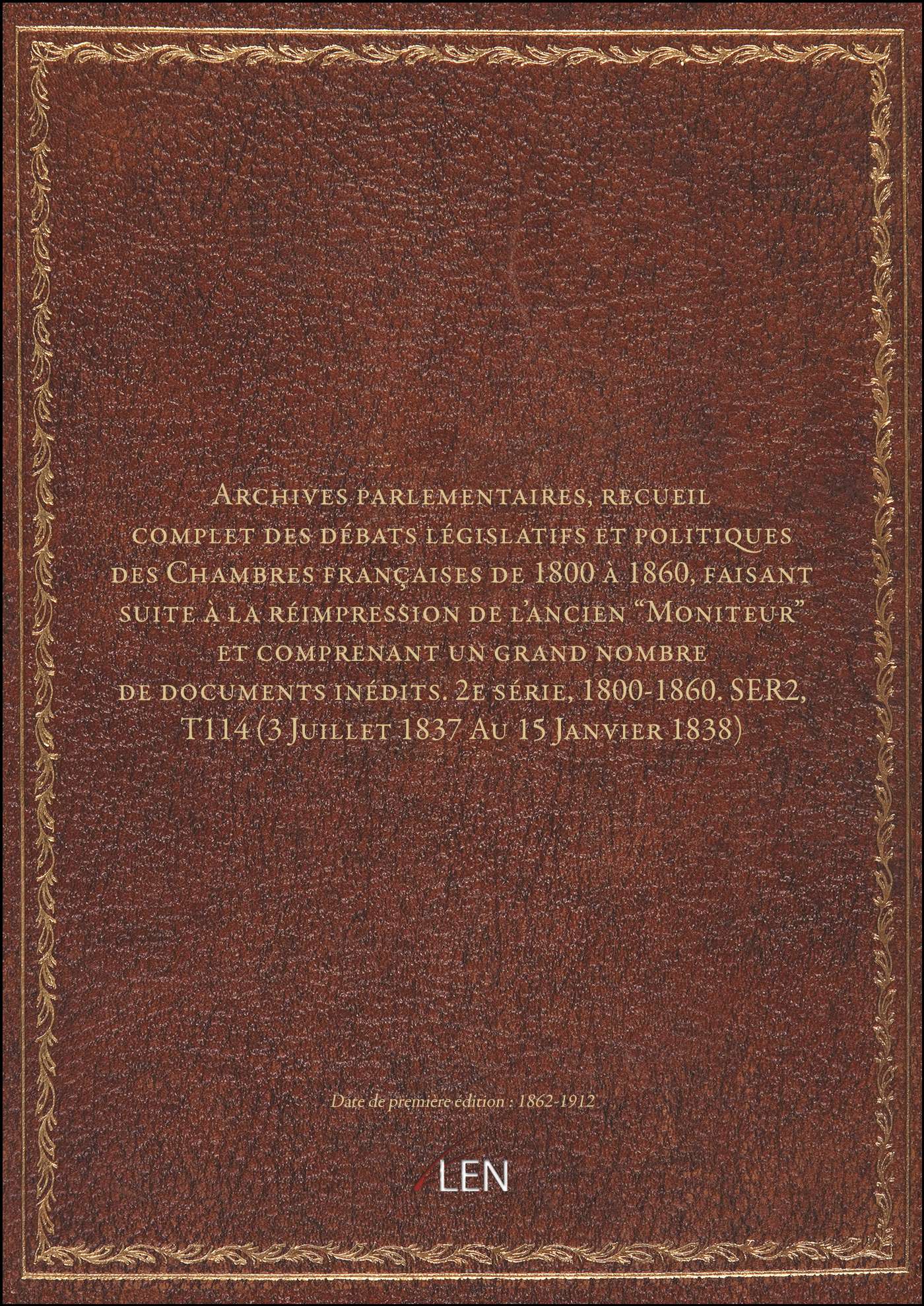 Titre complet : Archives parlementaires, recueil complet des débats législatifs et politiques des Chambres françaises de 1800 à 1860, faisant suite à la réimpression de l'ancien "Moniteur" et comprenant un grand nombre de documents inédits. 2e série, 1800-1860. SER2, T114 (3 Juillet 1837 Au 15 Janvier 1838)
