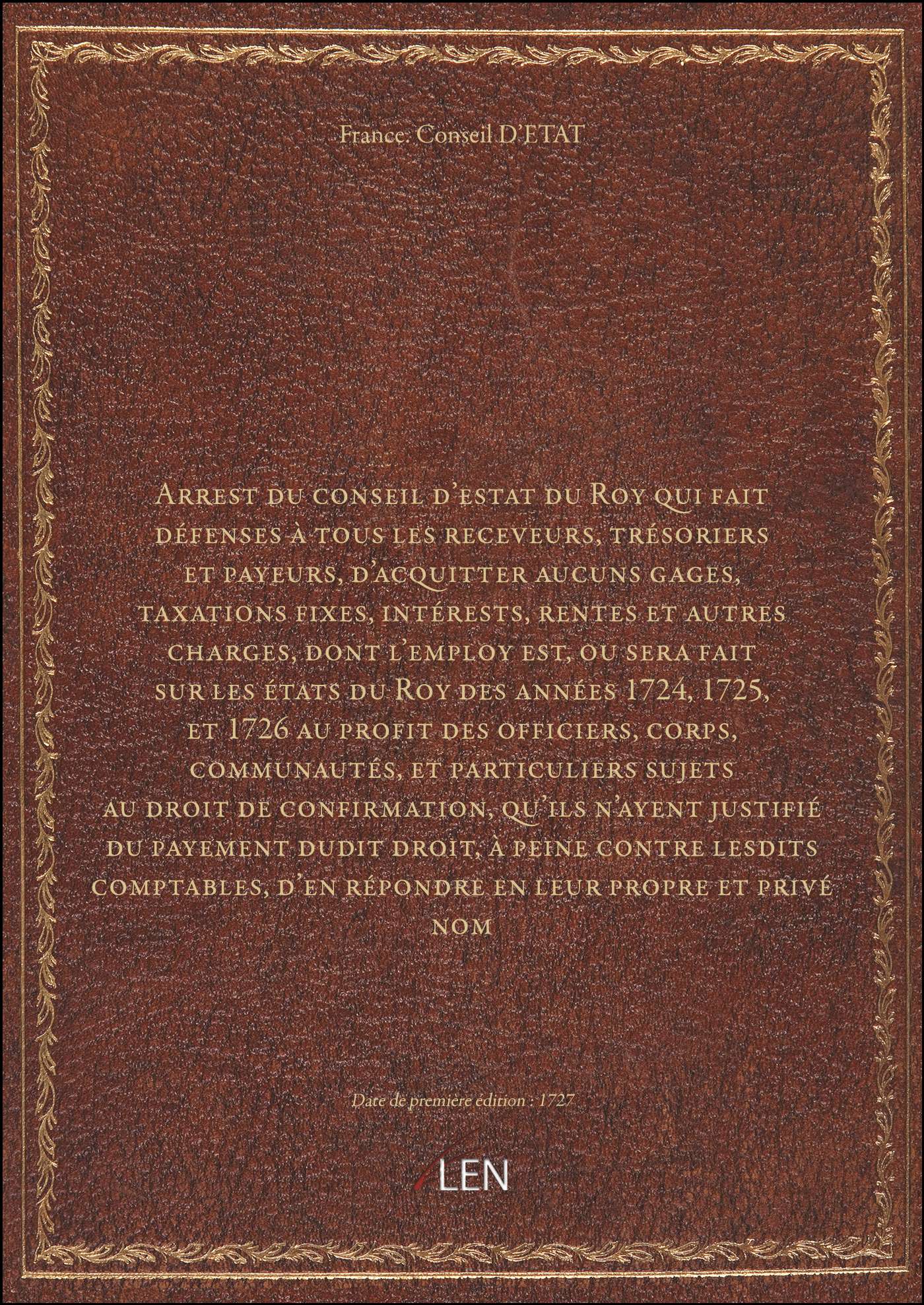 Titre complet : Arrest du conseil d'estat du Roy qui fait défenses à tous les receveurs, trésoriers et payeurs, d'acquitter aucuns gages, taxations fixes, intérests, rentes et autres charges, dont l'employ est, ou sera fait sur les états du Roy des années 1724, 1725, et 1726 au profit des officiers, corps, communautés, et particuliers sujets au droit de confirmation, qu'ils n'ayent justifié du payement dudit droit, à peine contre lesdits comptables, d'en répondre en leur propre et privé nom