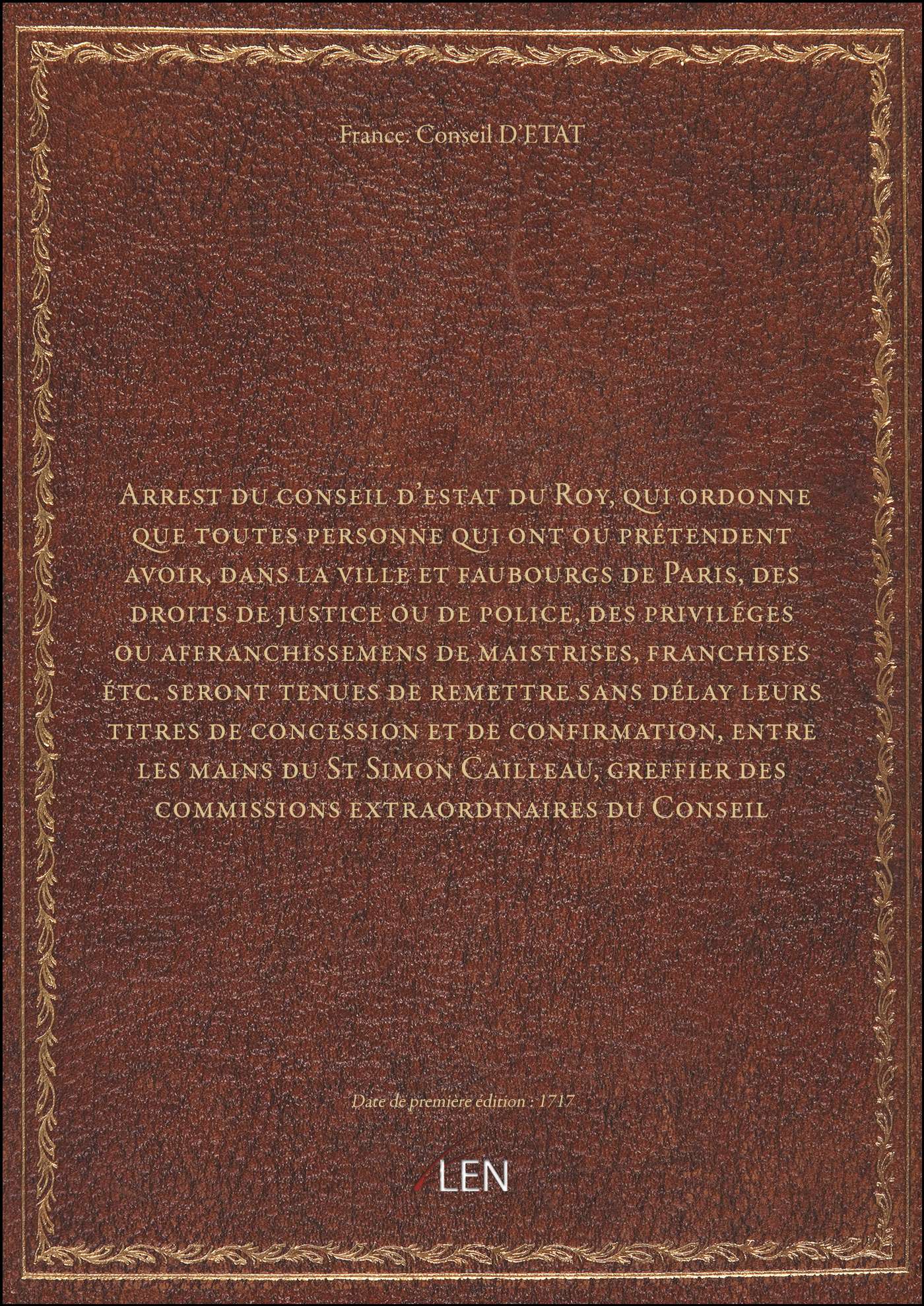 Titre complet : Arrest du conseil d'estat du Roy, qui ordonne que toutes personne qui ont ou prétendent avoir, dans la ville et faubourgs de Paris, des droits de justice ou de police, des priviléges ou affranchissemens de maistrises, franchises étc. seront tenues de remettre sans délay leurs titres de concession et de confirmation, entre les mains du St Simon Cailleau, greffier des commissions extraordinaires du Conseil