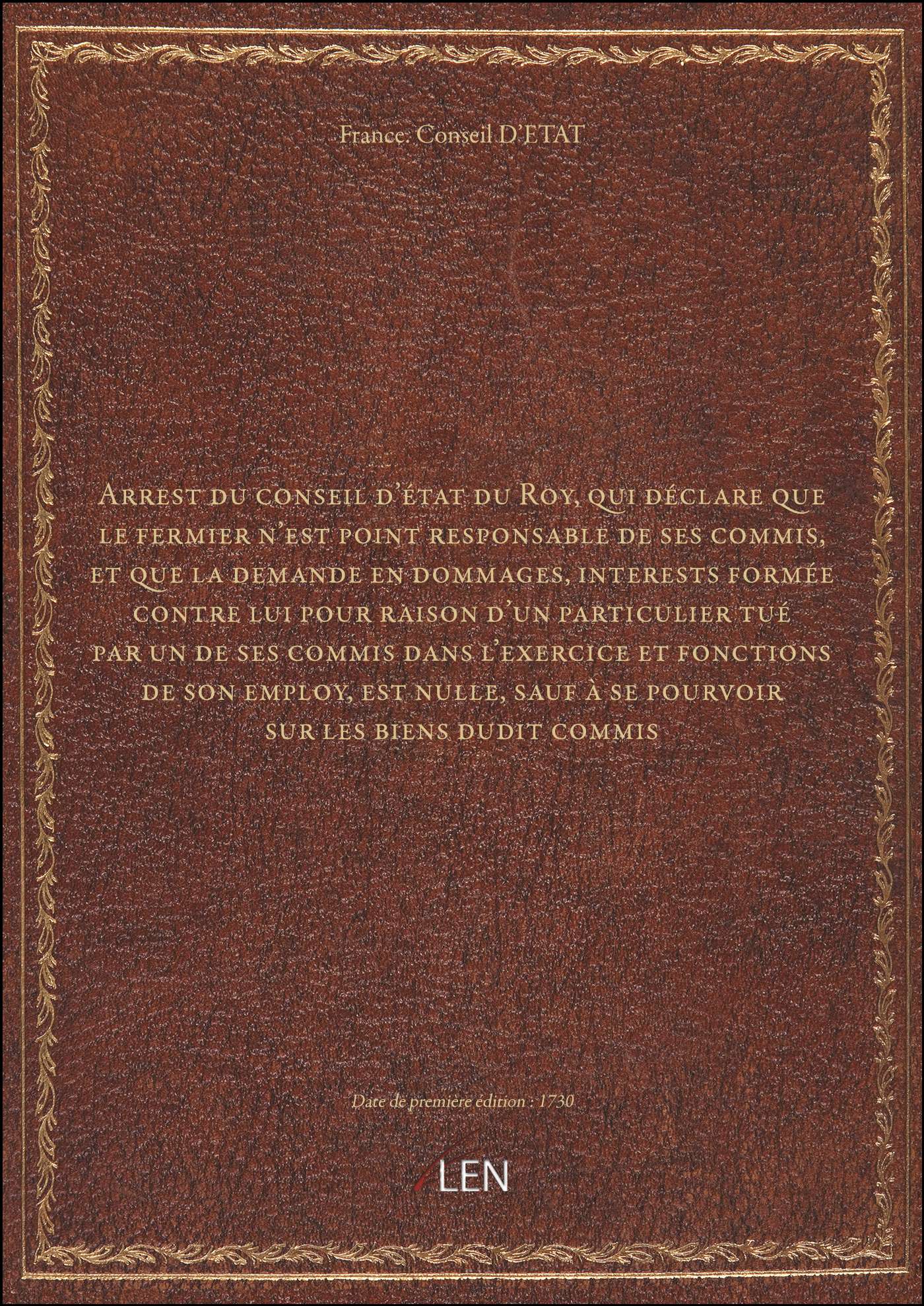Titre complet : Arrest du conseil d'état du Roy, qui déclare que le fermier n'est point responsable de ses commis, et que la demande en dommages, interests formée contre lui pour raison d'un particulier tué par un de ses commis dans l'exercice et fonctions de son employ, est nulle, sauf à se pourvoir sur les biens dudit commis