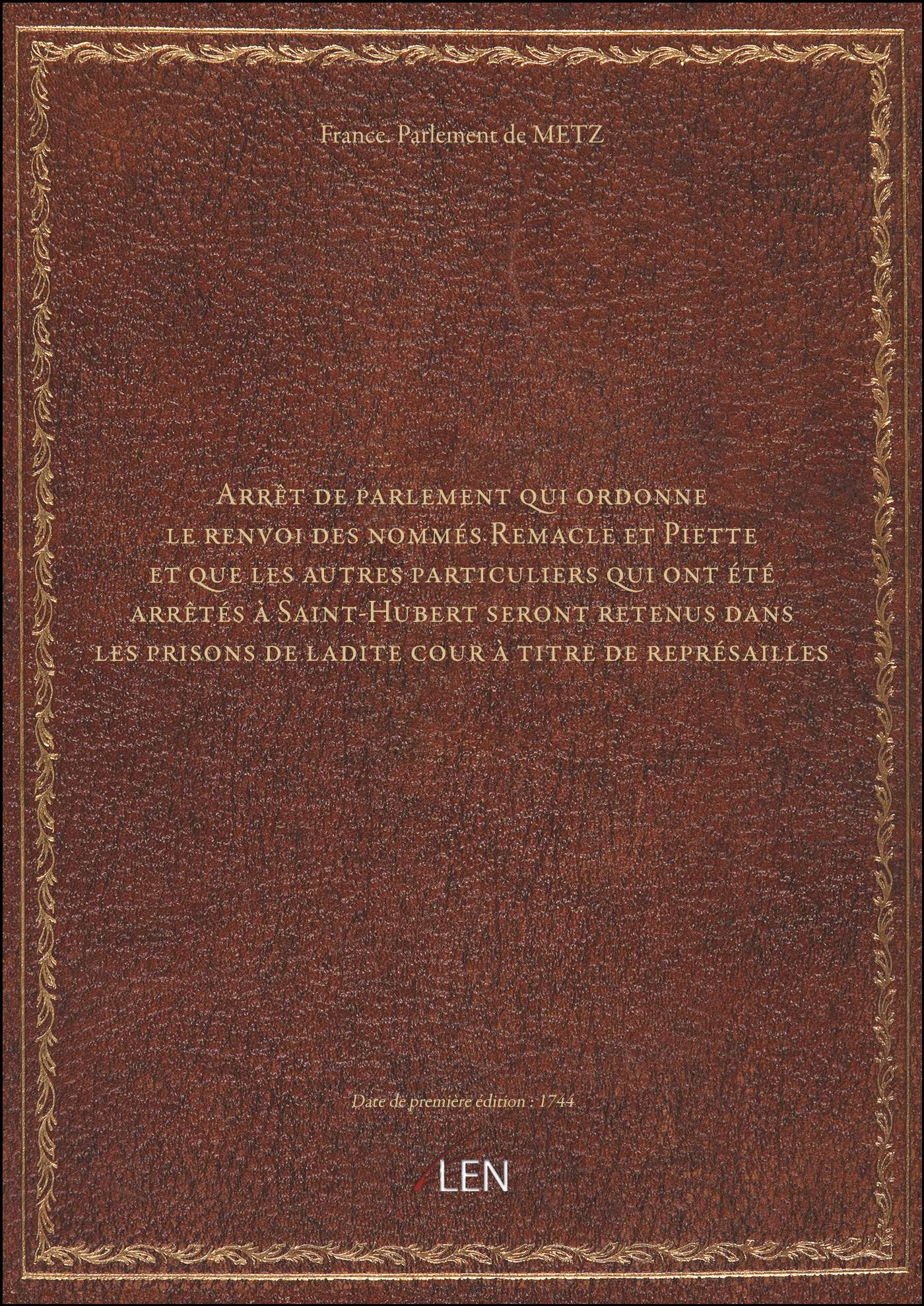 Titre complet : Arrêt de parlement qui ordonne le renvoi des nommés Remacle et Piette et que les autres particuliers qui ont été arrêtés à Saint-Hubert seront retenus dans les prisons de ladite cour à titre de représailles