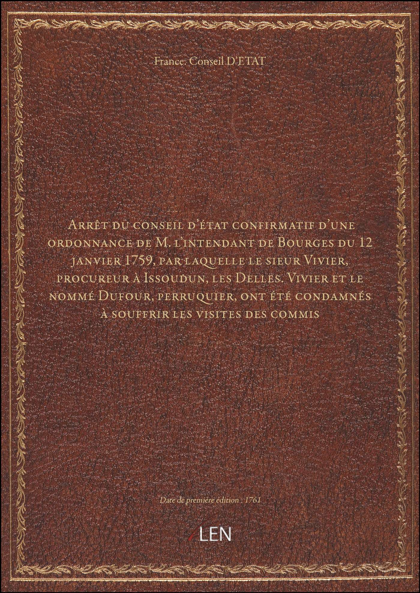 Titre complet : Arrêt du conseil d'état confirmatif d'une ordonnance de M. l'intendant de Bourges du 12 janvier 1759, par laquelle le sieur Vivier, procureur à Issoudun, les Delles. Vivier et le nommé Dufour, perruquier, ont été condamnés à souffrir les visites des commis
