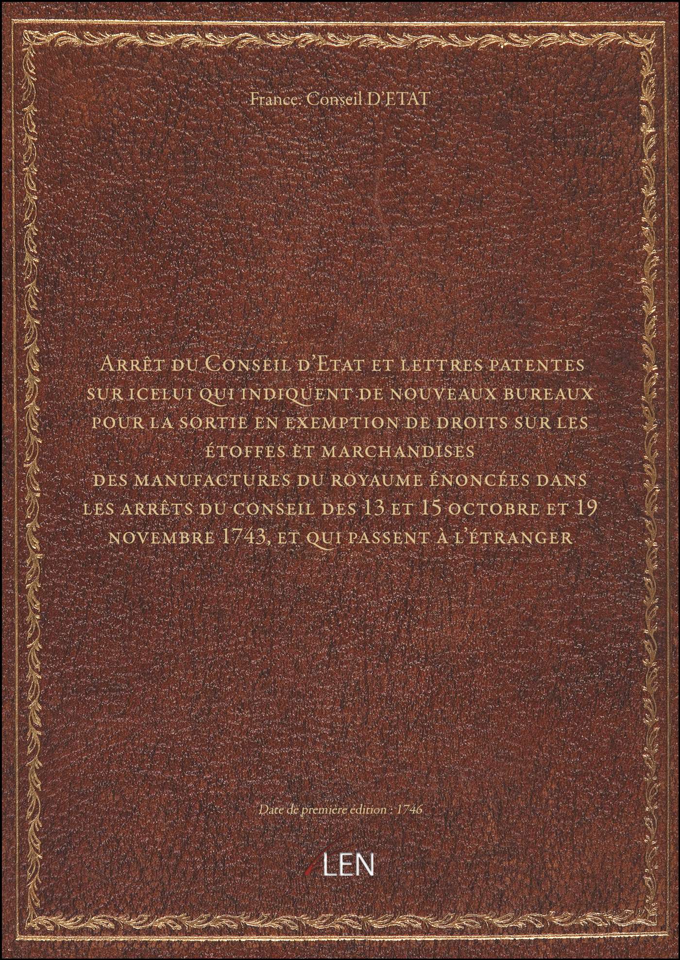 Titre complet : Arrêt du Conseil d'Etat et lettres patentes sur icelui qui indiquent de nouveaux bureaux pour la sortie en exemption de droits sur les étoffes et marchandises des manufactures du royaume énoncées dans les arrêts du conseil des 13 et 15 octobre et 19 novembre 1743, et qui passent à l'étranger