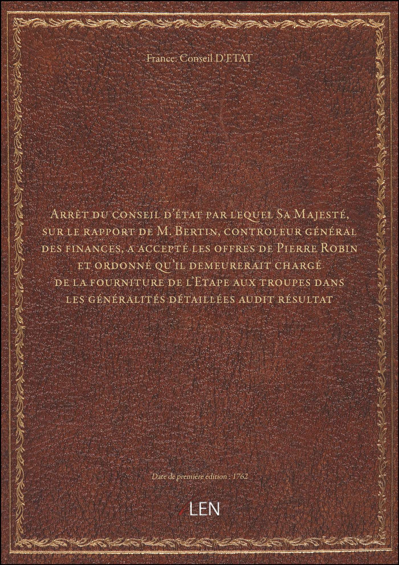 Titre complet : Arrêt du conseil d'état par lequel Sa Majesté, sur le rapport de M. Bertin, controleur général des finances, a accepté les offres de Pierre Robin et ordonné qu'il demeurerait chargé de la fourniture de l'Etape aux troupes dans les généralités détaillées audit résultat
