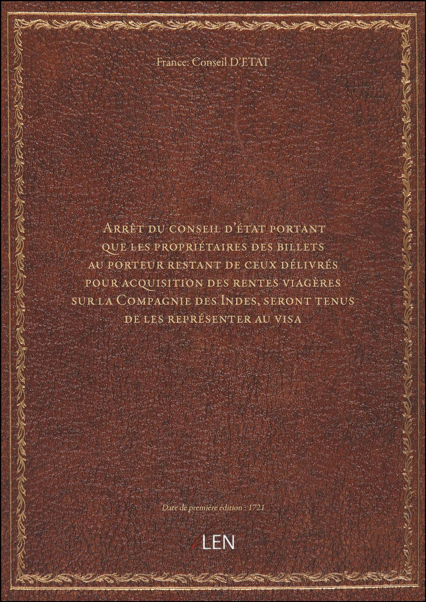 Titre complet : Arrêt du conseil d'état portant que les propriétaires des billets au porteur restant de ceux délivrés pour acquisition des rentes viagères sur la Compagnie des Indes, seront tenus de les représenter au visa
