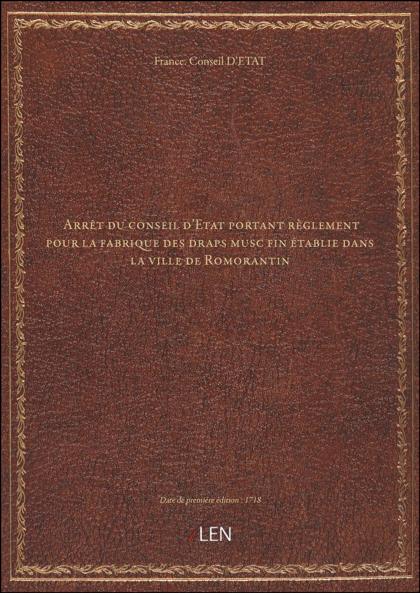 Titre complet : Arrêt du conseil d'Etat portant règlement pour la fabrique des draps musc fin établie dans la ville de Romorantin