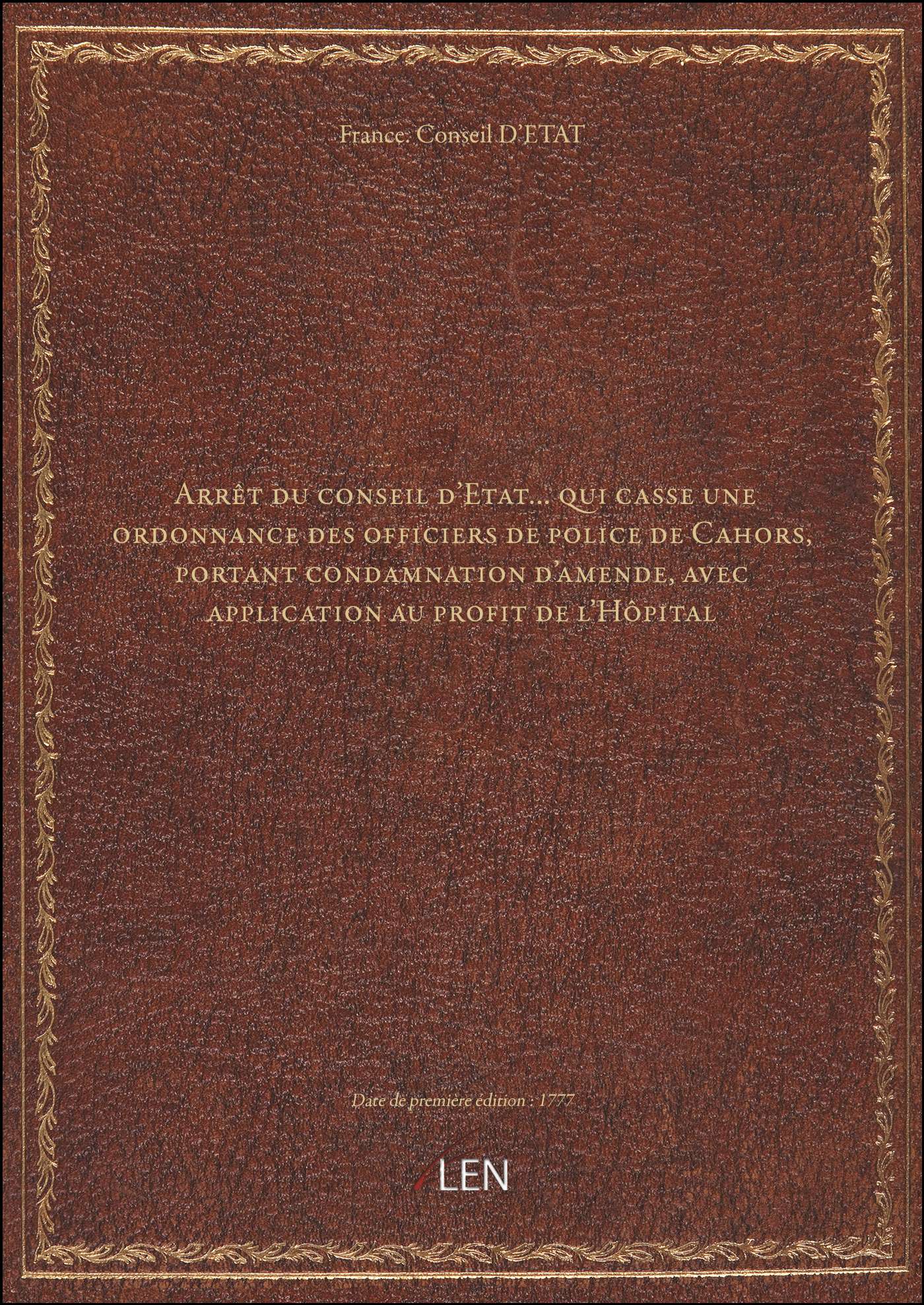 Titre complet : Arrêt du conseil d'Etat... qui casse une ordonnance des officiers de police de Cahors, portant condamnation d'amende, avec application au profit de l'Hôpital