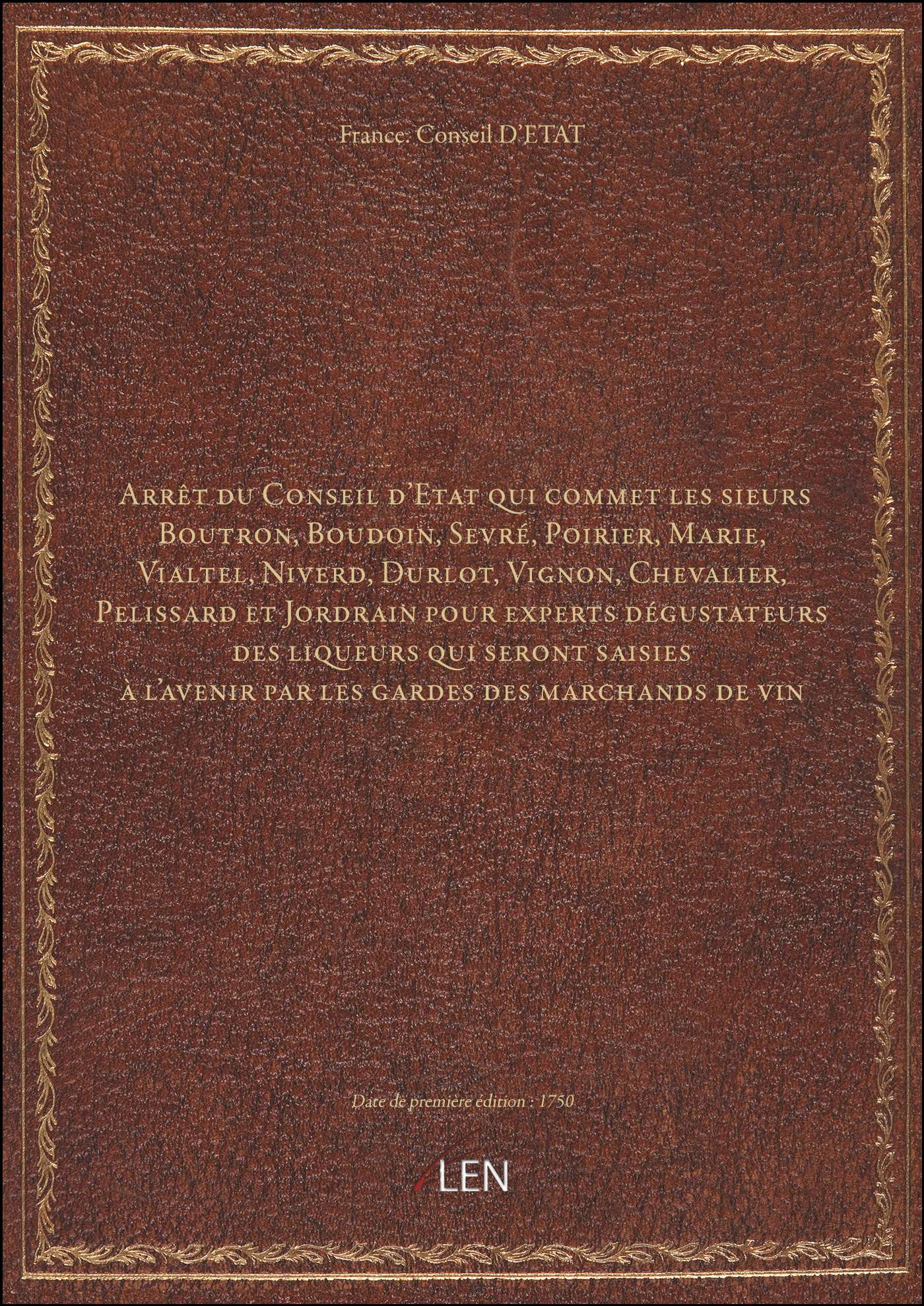 Titre complet : Arrêt du Conseil d'Etat qui commet les sieurs Boutron, Boudoin, Sevré, Poirier, Marie, Vialtel, Niverd, Durlot, Vignon, Chevalier, Pelissard et Jordrain pour experts dégustateurs des liqueurs qui seront saisies à l'avenir par les gardes des marchands de vin