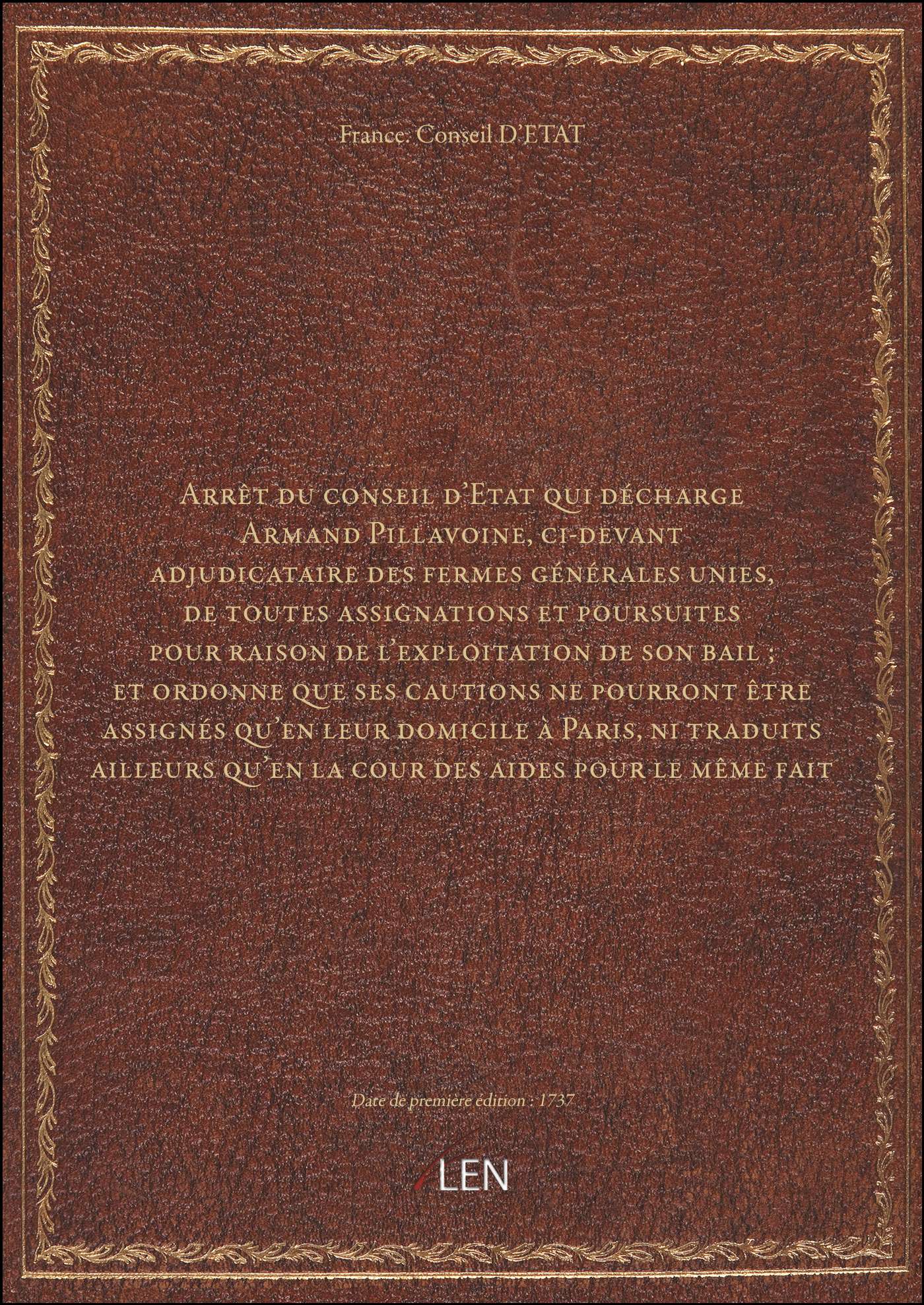 Titre complet : Arrêt du conseil d'Etat qui décharge Armand Pillavoine, ci-devant adjudicataire des fermes générales unies, de toutes assignations et poursuites pour raison de l'exploitation de son bail ; et ordonne que ses cautions ne pourront être assignés qu'en leur domicile à Paris, ni traduits ailleurs qu'en la cour des aides pour le même fait