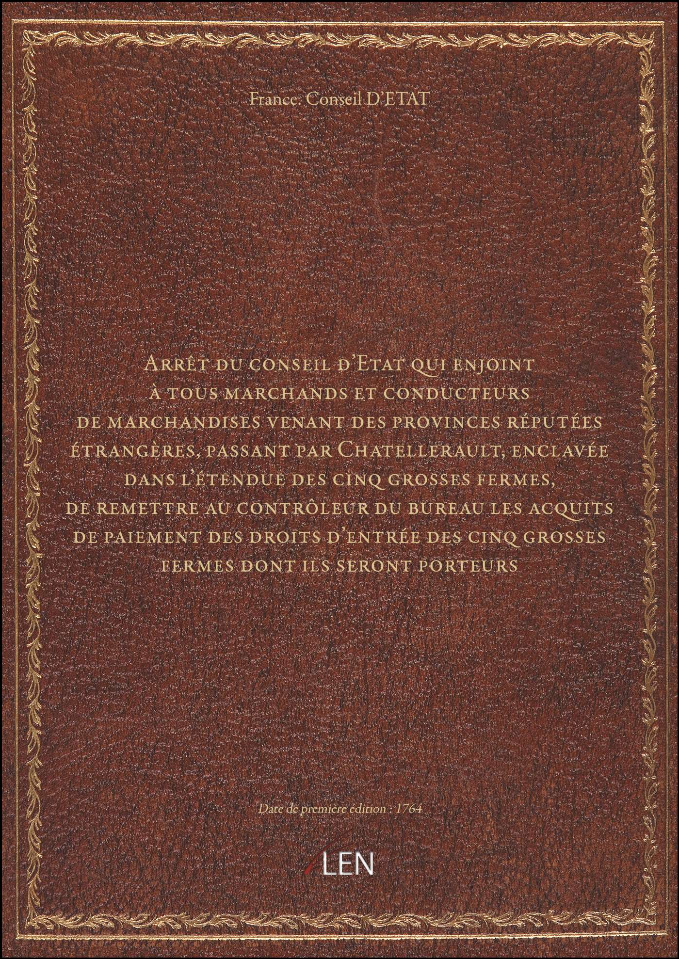 Titre complet : Arrêt du conseil d'Etat qui enjoint à tous marchands et conducteurs de marchandises venant des provinces réputées étrangères, passant par Chatellerault, enclavée dans l'étendue des cinq grosses fermes, de remettre au contrôleur du bureau les acquits de paiement des droits d'entrée des cinq grosses fermes dont ils seront porteurs