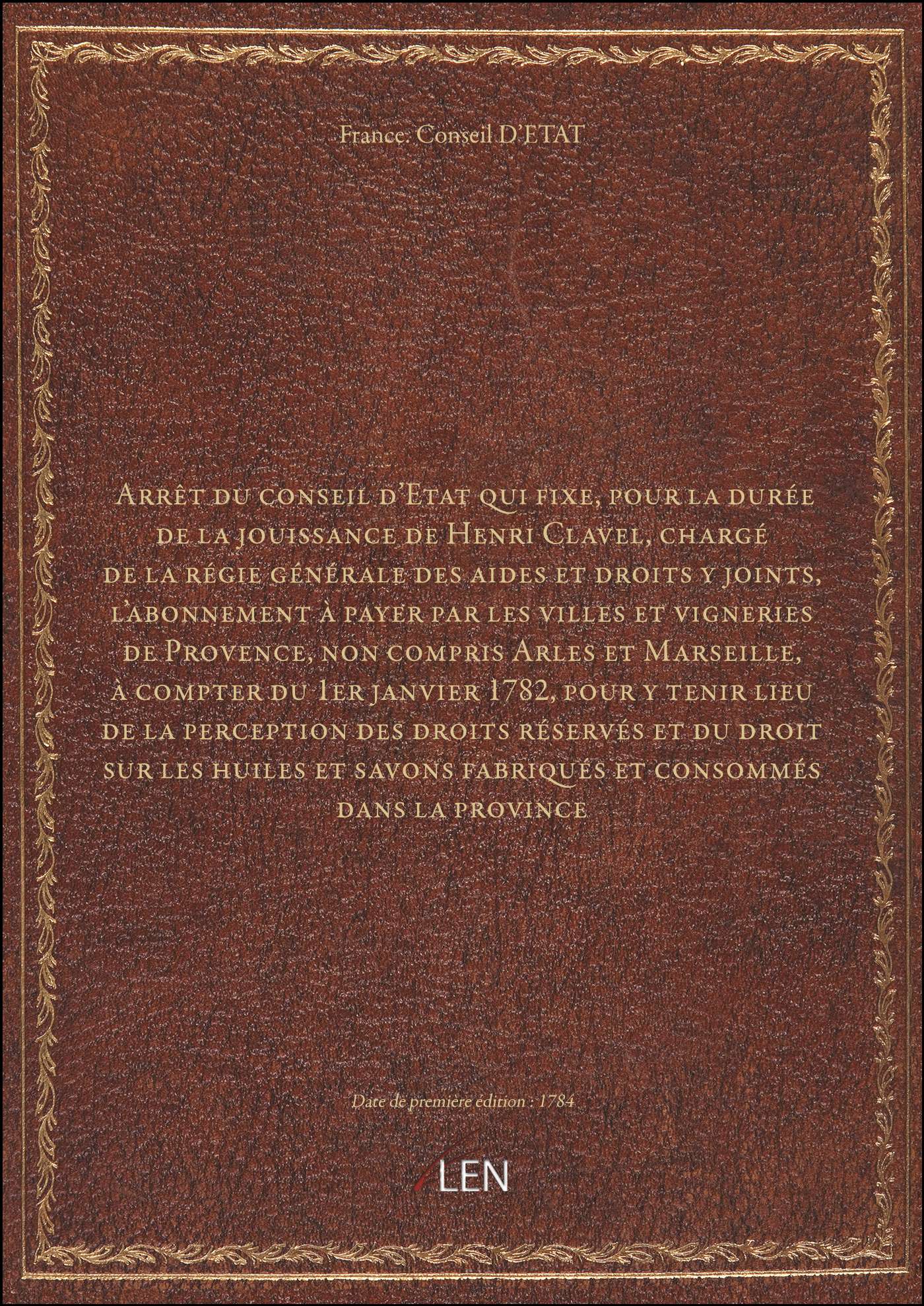 Titre complet : Arrêt du conseil d'Etat qui fixe, pour la durée de la jouissance de Henri Clavel, chargé de la régie générale des aides et droits y joints, l'abonnement à payer par les villes et vigneries de Provence, non compris Arles et Marseille, à compter du 1er janvier 1782, pour y tenir lieu de la perception des droits réservés et du droit sur les huiles et savons fabriqués et consommés dans la province