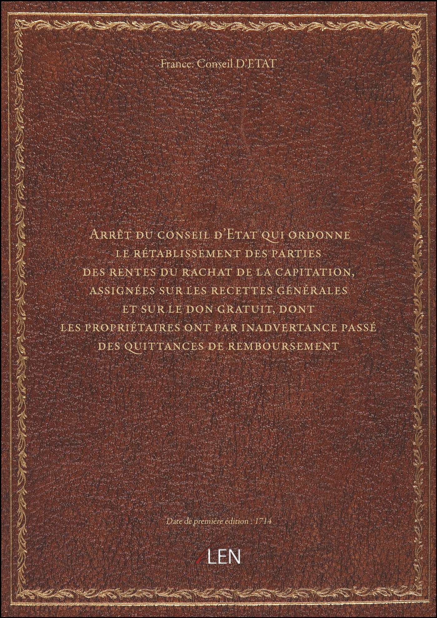 Titre complet : Arrêt du conseil d'Etat qui ordonne le rétablissement des parties des rentes du rachat de la capitation, assignées sur les recettes générales et sur le don gratuit, dont les propriétaires ont par inadvertance passé des quittances de remboursement