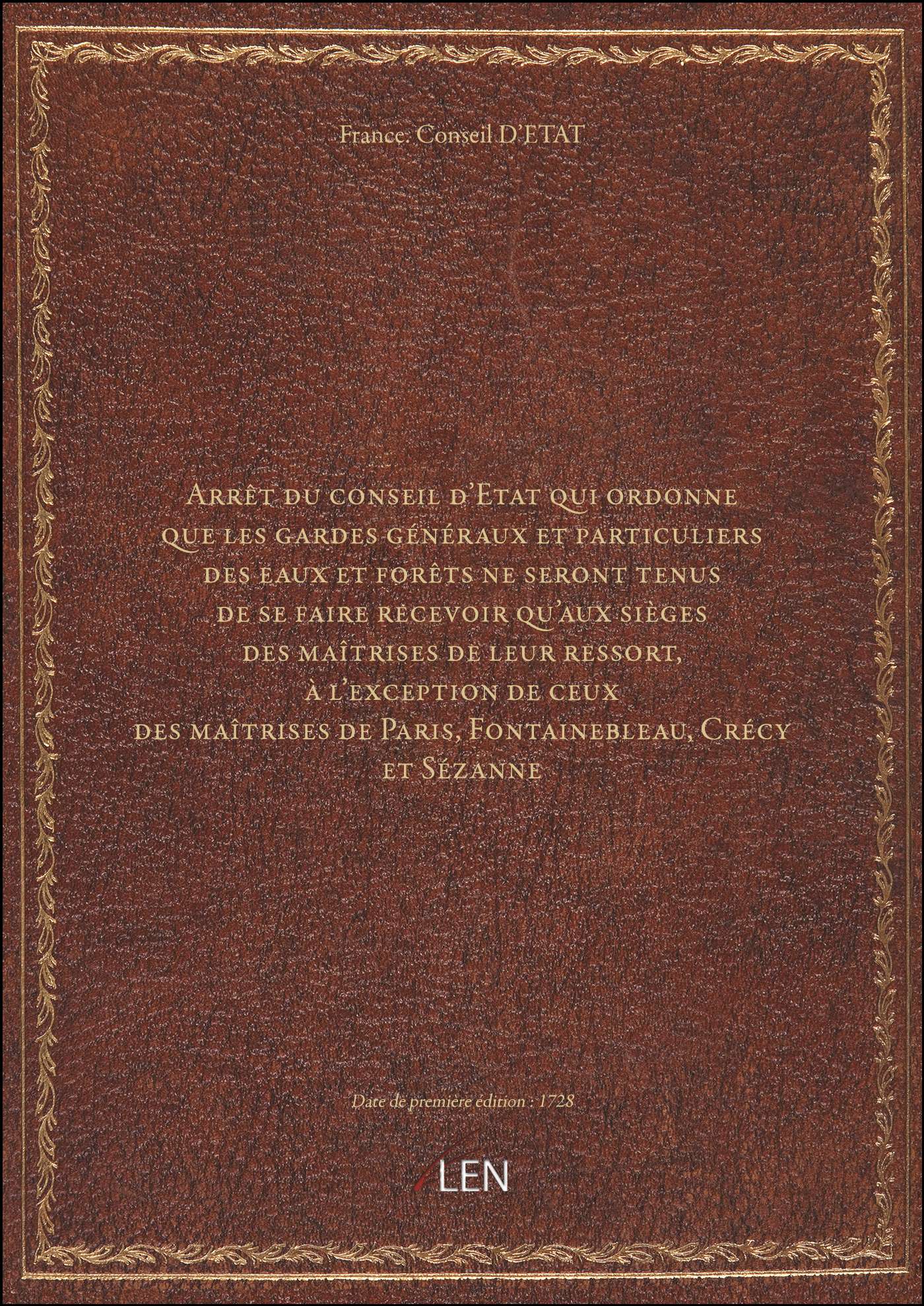 Titre complet : Arrêt du conseil d'Etat qui ordonne que les gardes généraux et particuliers des eaux et forêts ne seront tenus de se faire recevoir qu'aux sièges des maîtrises de leur ressort, à l'exception de ceux des maîtrises de Paris, Fontainebleau, Crécy et Sézanne