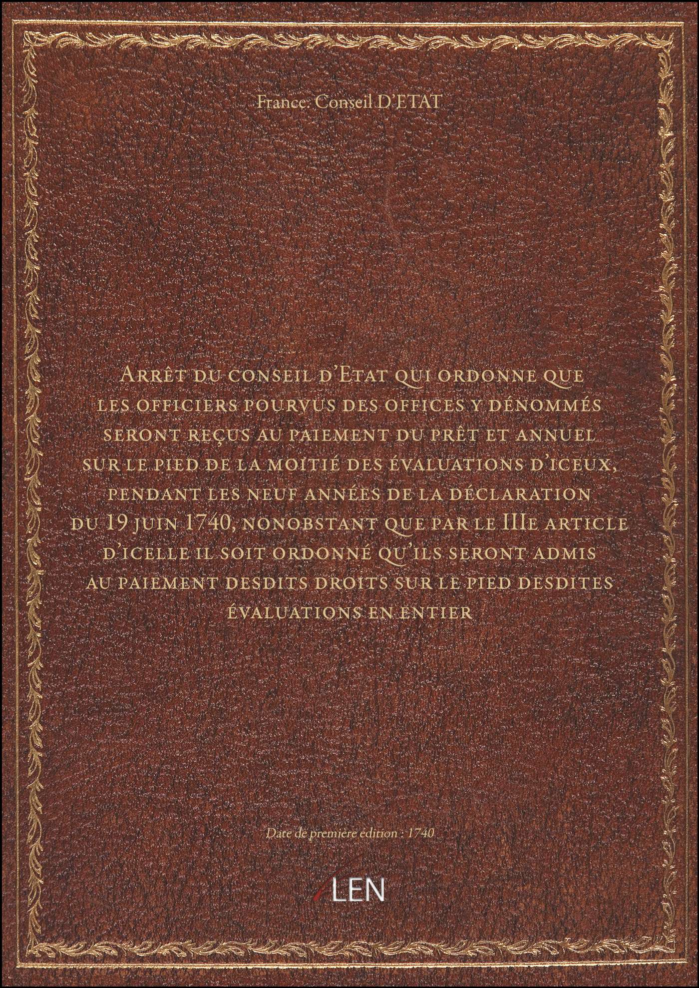 Titre complet : Arrêt du conseil d'Etat qui ordonne que les officiers pourvus des offices y dénommés seront reçus au paiement du prêt et annuel sur le pied de la moitié des évaluations d'iceux, pendant les neuf années de la déclaration du 19 juin 1740, nonobstant que par le IIIe article d'icelle il soit ordonné qu'ils seront admis au paiement desdits droits sur le pied desdites évaluations en entier