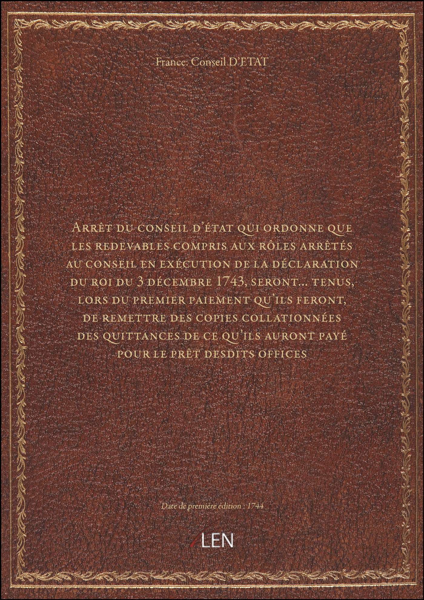Titre complet : Arrêt du conseil d'état qui ordonne que les redevables compris aux rôles arrêtés au conseil en exécution de la déclaration du roi du 3 décembre 1743, seront... tenus, lors du premier paiement qu'ils feront, de remettre des copies collationnées des quittances de ce qu'ils auront payé pour le prêt desdits offices