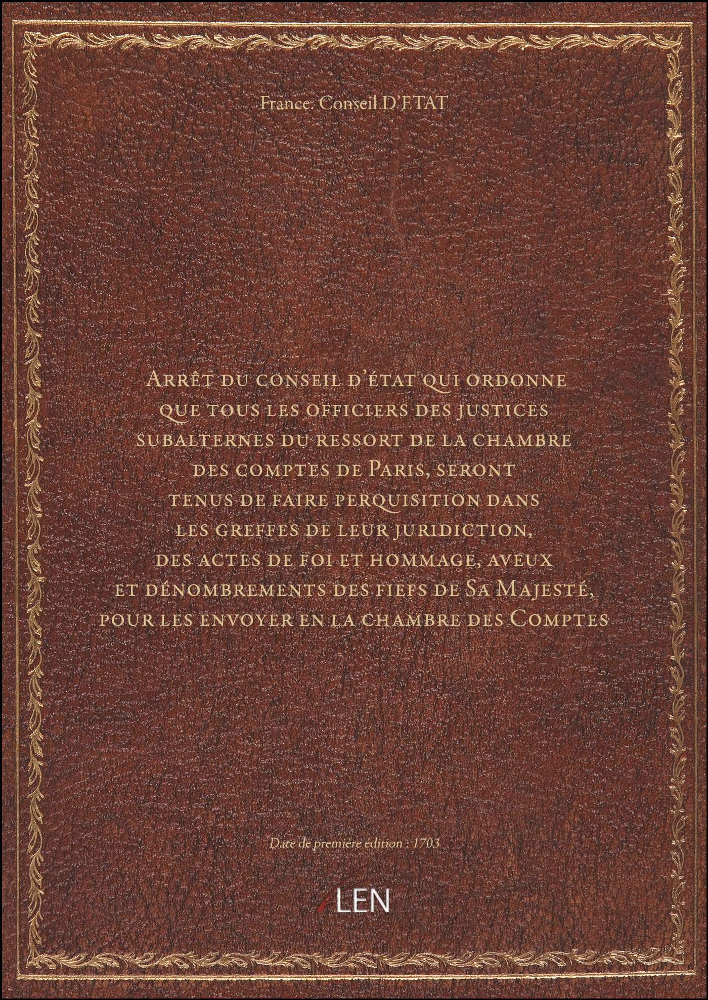 Titre complet : Arrêt du conseil d'état qui ordonne que tous les officiers des justices subalternes du ressort de la chambre des comptes de Paris, seront tenus de faire perquisition dans les greffes de leur juridiction, des actes de foi et hommage, aveux et dénombrements des fiefs de Sa Majesté, pour les envoyer en la chambre des Comptes