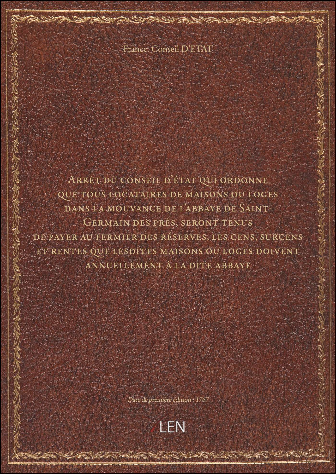Titre complet : Arrêt du conseil d'état qui ordonne que tous locataires de maisons ou loges dans la mouvance de l'abbaye de Saint-Germain des près, seront tenus de payer au fermier des réserves, les cens, surcens et rentes que lesdites maisons ou loges doivent annuellement à la dite abbaye