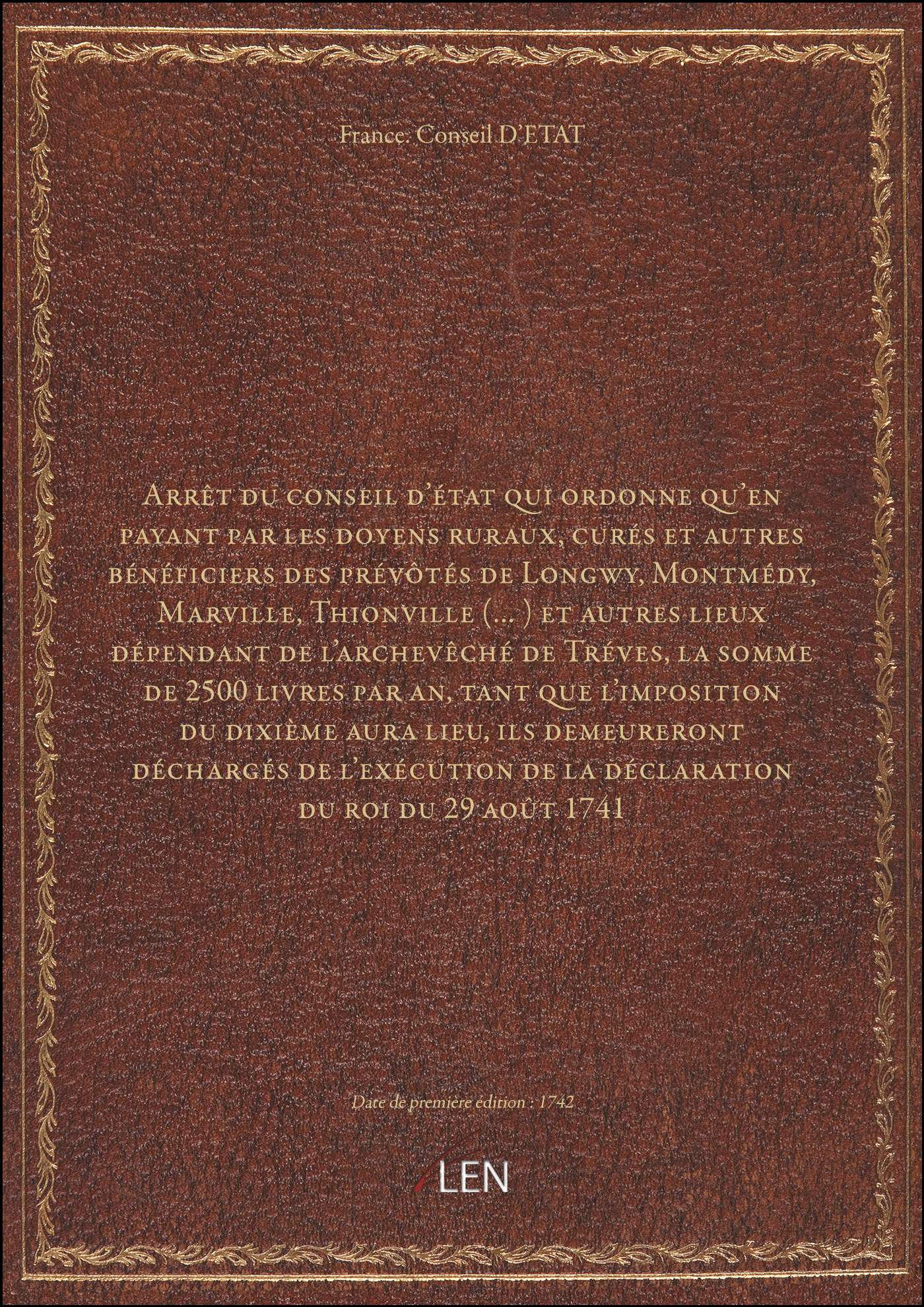 Titre complet : Arrêt du conseil d'état qui ordonne qu'en payant par les doyens ruraux, curés et autres bénéficiers des prévôtés de Longwy, Montmédy, Marville, Thionville (...) et autres lieux dépendant de l'archevêché de Tréves, la somme de 2500 livres par an, tant que l'imposition du dixième aura lieu, ils demeureront déchargés de l'exécution de la déclaration du roi du 29 août 1741