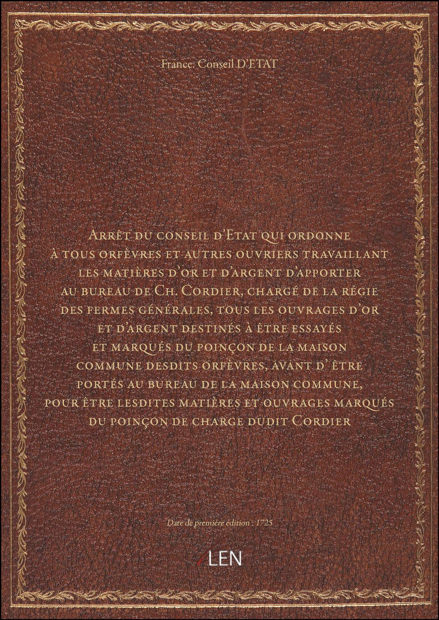 Titre complet : Arrêt du conseil d'Etat qui ordonne à tous orfèvres et autres ouvriers travaillant les matières d'or et d'argent d'apporter au bureau de Ch. Cordier, chargé de la régie des fermes générales, tous les ouvrages d'or et d'argent destinés à être essayés et marqués du poinçon de la maison commune desdits orfèvres, avant d' être portés au bureau de la maison commune, pour être lesdites matières et ouvrages marqués du poinçon de charge dudit Cordier