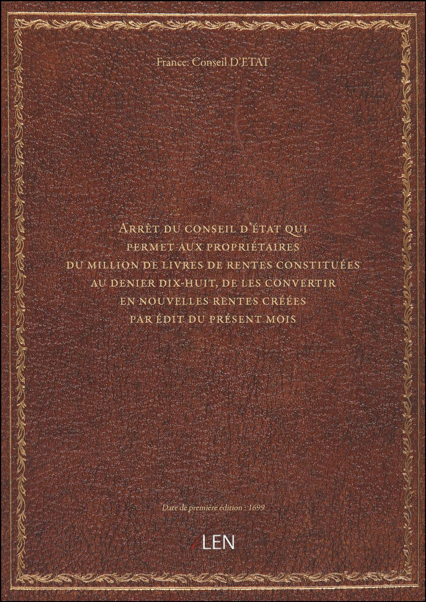 Titre complet : Arrêt du conseil d'état qui permet aux propriétaires du million de livres de rentes constituées au denier dix-huit, de les convertir en nouvelles rentes créées par édit du présent mois