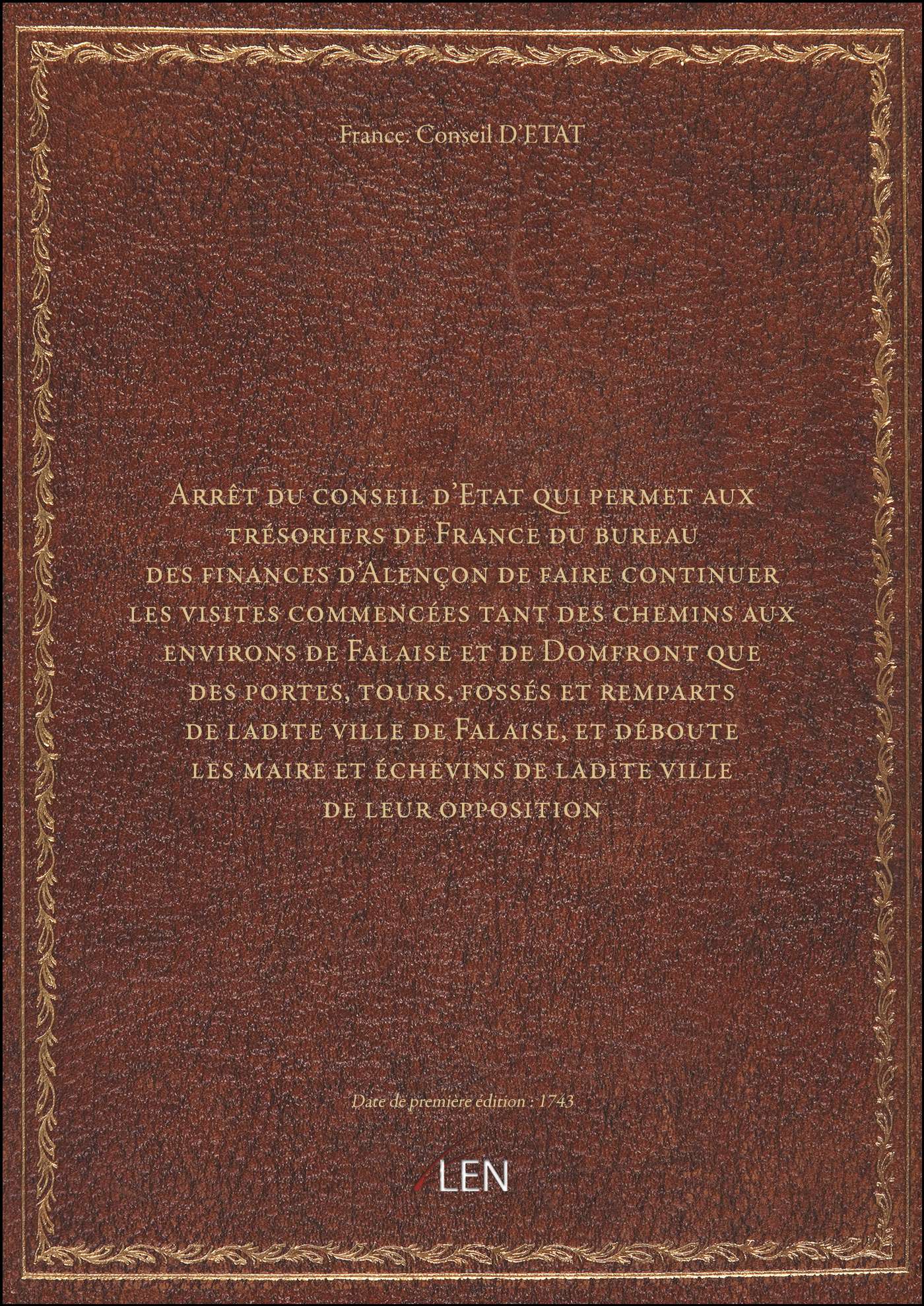 Titre complet : Arrêt du conseil d'Etat qui permet aux trésoriers de France du bureau des finances d'Alençon de faire continuer les visites commencées tant des chemins aux environs de Falaise et de Domfront que des portes, tours, fossés et remparts de ladite ville de Falaise, et déboute les maire et échevins de ladite ville de leur opposition