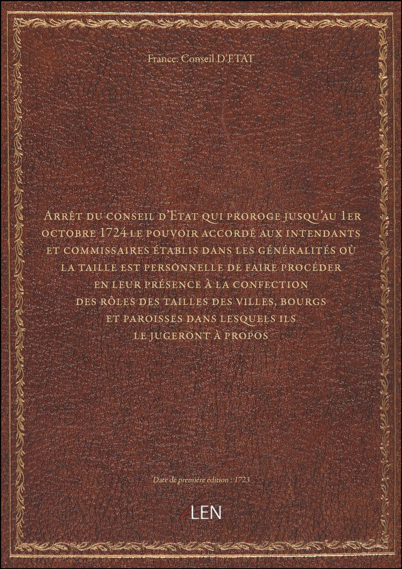 Titre complet : Arrêt du conseil d'Etat qui proroge jusqu'au 1er octobre 1724 le pouvoir accordé aux intendants et commissaires établis dans les généralités où la taille est personnelle de faire procéder en leur présence à la confection des rôles des tailles des villes, bourgs et paroisses dans lesquels ils le jugeront à propos