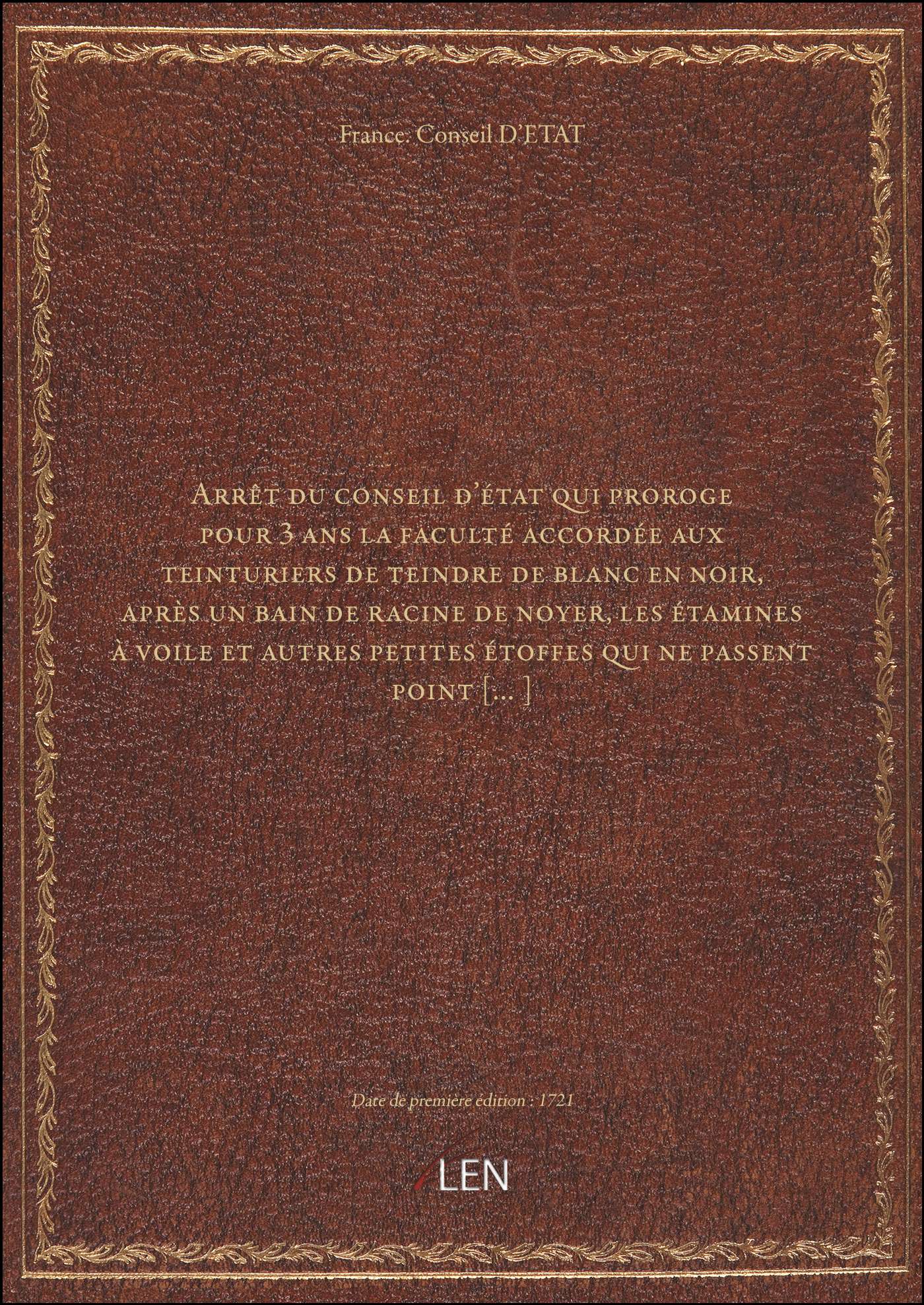 Titre complet : Arrêt du conseil d'état qui proroge pour 3 ans la faculté accordée aux teinturiers de teindre de blanc en noir, après un bain de racine de noyer, les étamines à voile et autres petites étoffes qui ne passent point [...]