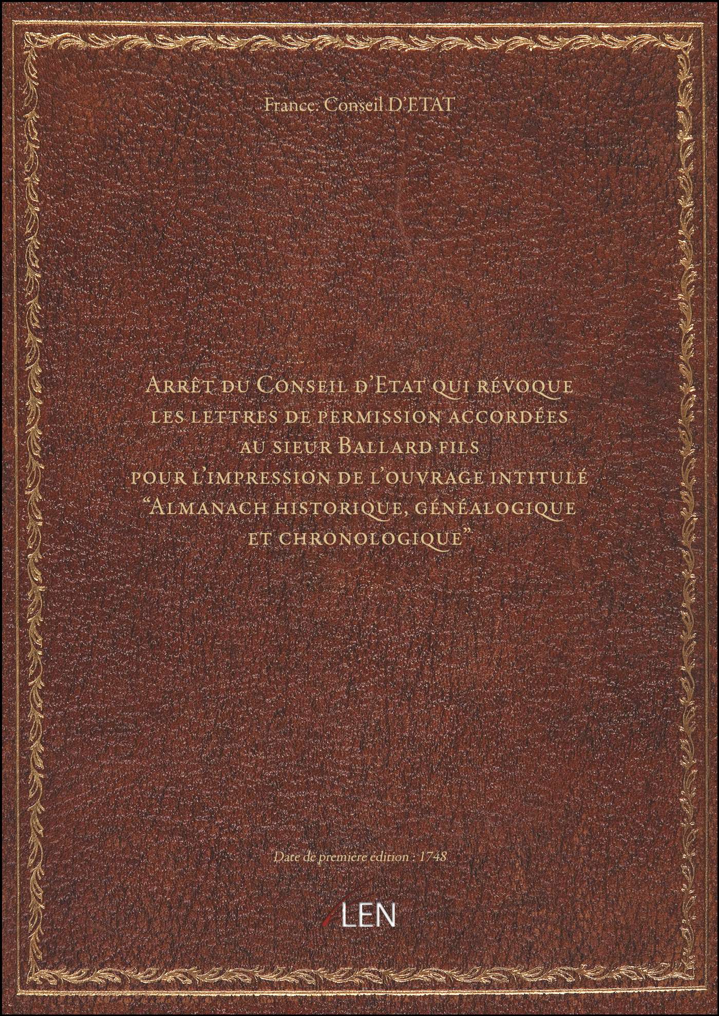 Titre complet : Arrêt du Conseil d'Etat qui révoque les lettres de permission accordées au sieur Ballard fils pour l'impression de l'ouvrage intitulé "Almanach historique, généalogique et chronologique"