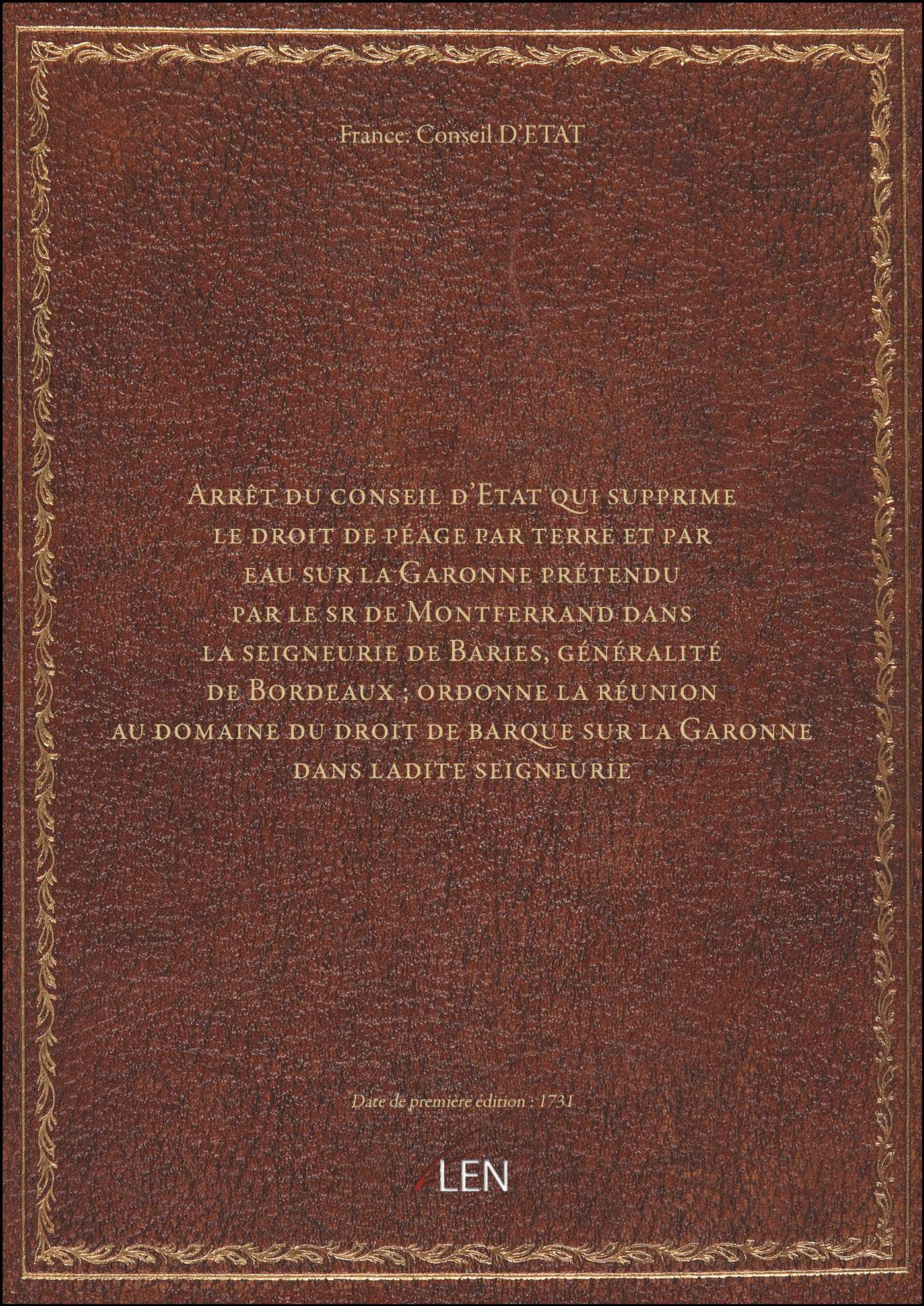 Titre complet : Arrêt du conseil d'Etat qui supprime le droit de péage par terre et par eau sur la Garonne prétendu par le sr de Montferrand dans la seigneurie de Baries, généralité de Bordeaux ; ordonne la réunion au domaine du droit de barque sur la Garonne dans ladite seigneurie