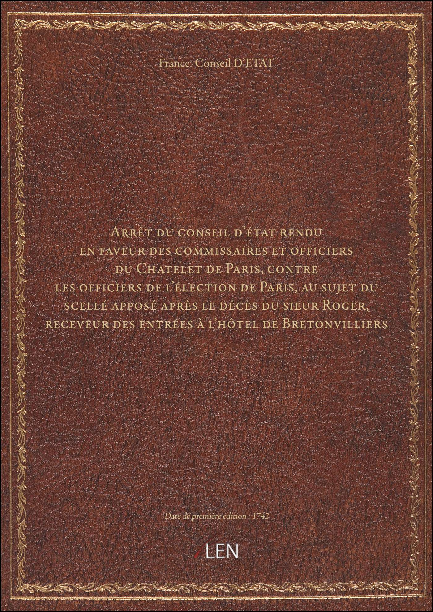 Titre complet : Arrêt du conseil d'état rendu en faveur des commissaires et officiers du Chatelet de Paris, contre les officiers de l'élection de Paris, au sujet du scellé apposé après le décès du sieur Roger, receveur des entrées à l'hôtel de Bretonvilliers