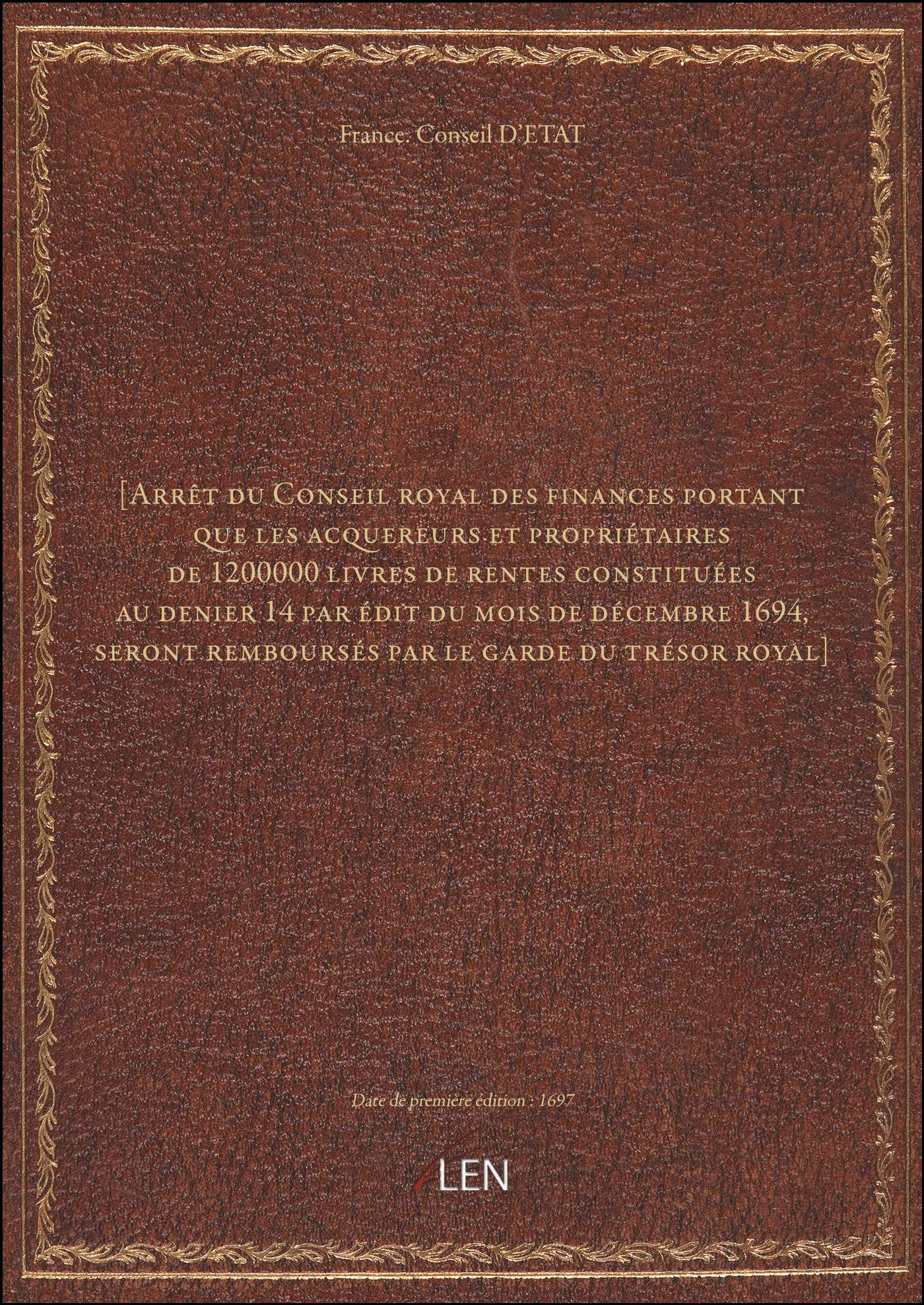 Titre complet : [Arrêt du Conseil royal des finances portant que les acquereurs et propriétaires de 1200000 livres de rentes constituées au denier 14 par édit du mois de décembre 1694, seront remboursés par le garde du trésor royal]