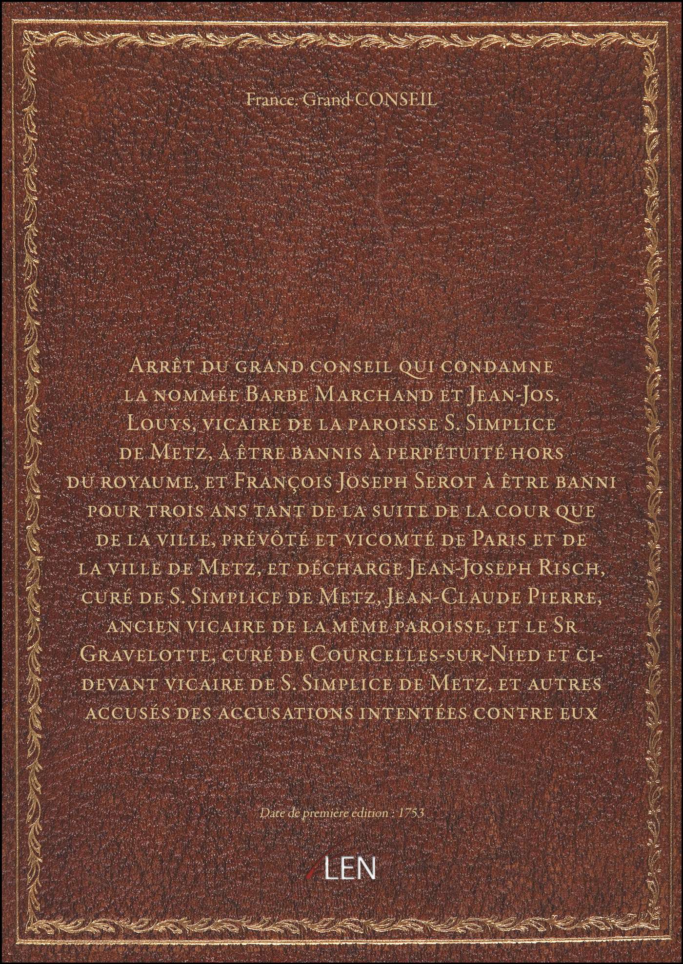 Titre complet : Arrêt du grand conseil qui condamne la nommée Barbe Marchand et Jean-Jos. Louys, vicaire de la paroisse S. Simplice de Metz, à être bannis à perpétuité hors du royaume, et François Joseph Serot à être banni pour trois ans tant de la suite de la cour que de la ville, prévôté et vicomté de Paris et de la ville de Metz, et décharge Jean-Joseph Risch, curé de S. Simplice de Metz, Jean-Claude Pierre, ancien vicaire de la même paroisse, et le Sr Gravelotte, curé de Courcelles-sur-Nied et ci-devant vicaire de S. Simplice de Metz, et autres accusés des accusations intentées contre eux