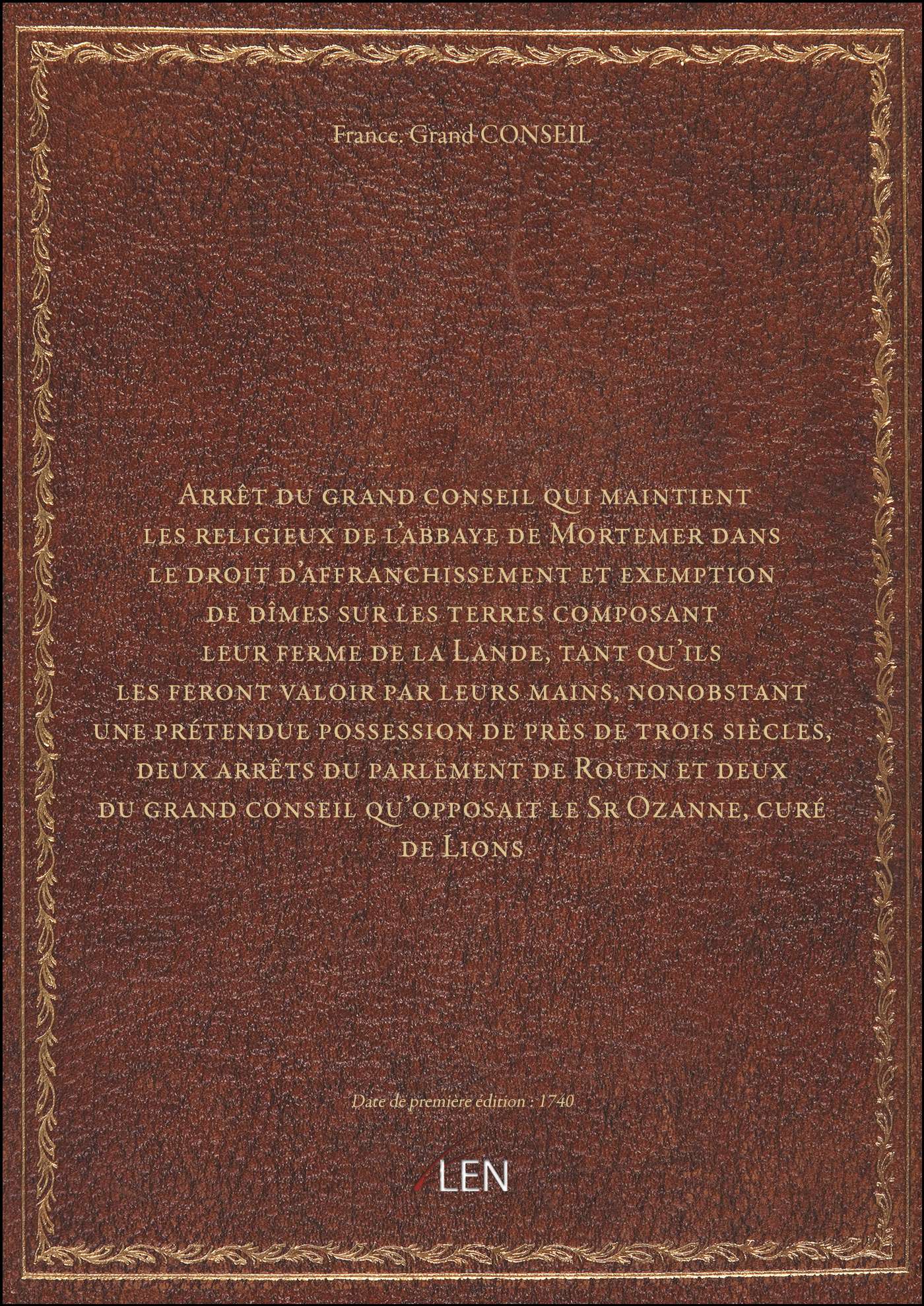 Titre complet : Arrêt du grand conseil qui maintient les religieux de l'abbaye de Mortemer dans le droit d'affranchissement et exemption de dîmes sur les terres composant leur ferme de la Lande, tant qu'ils les feront valoir par leurs mains, nonobstant une prétendue possession de près de trois siècles, deux arrêts du parlement de Rouen et deux du grand conseil qu'opposait le Sr Ozanne, curé de Lions