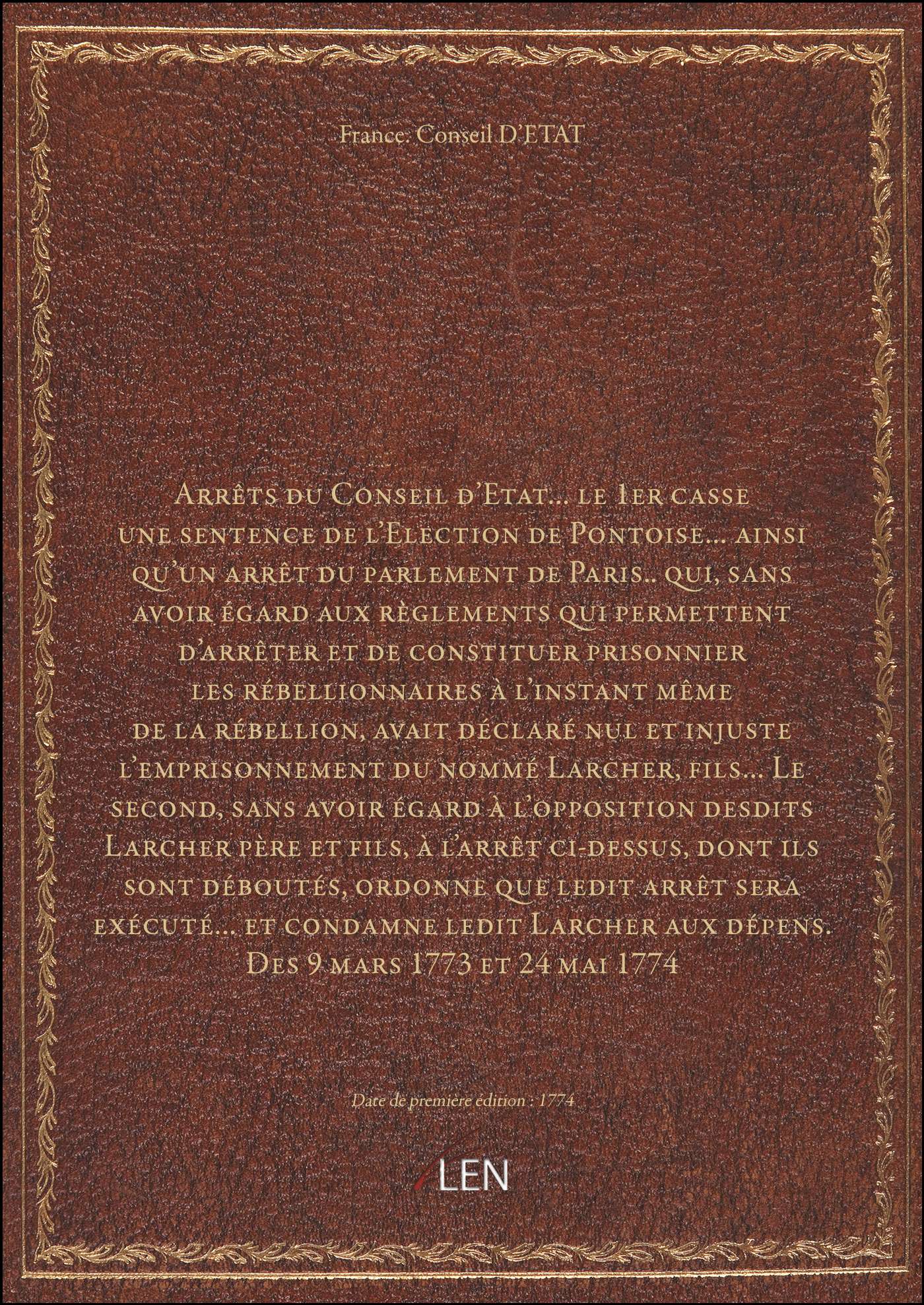 Titre complet : Arrêts du Conseil d'Etat... le 1er casse une sentence de l'Election de Pontoise... ainsi qu'un arrêt du parlement de Paris.. qui, sans avoir égard aux règlements qui permettent d'arrêter et de constituer prisonnier les rébellionnaires à l'instant même de la rébellion, avait déclaré nul et injuste l'emprisonnement du nommé Larcher, fils... Le second, sans avoir égard à l'opposition desdits Larcher père et fils, à l'arrêt ci-dessus, dont ils sont déboutés, ordonne que ledit arrêt sera exécuté... et condamne ledit Larcher aux dépens. Des 9 mars 1773 et 24 mai 1774