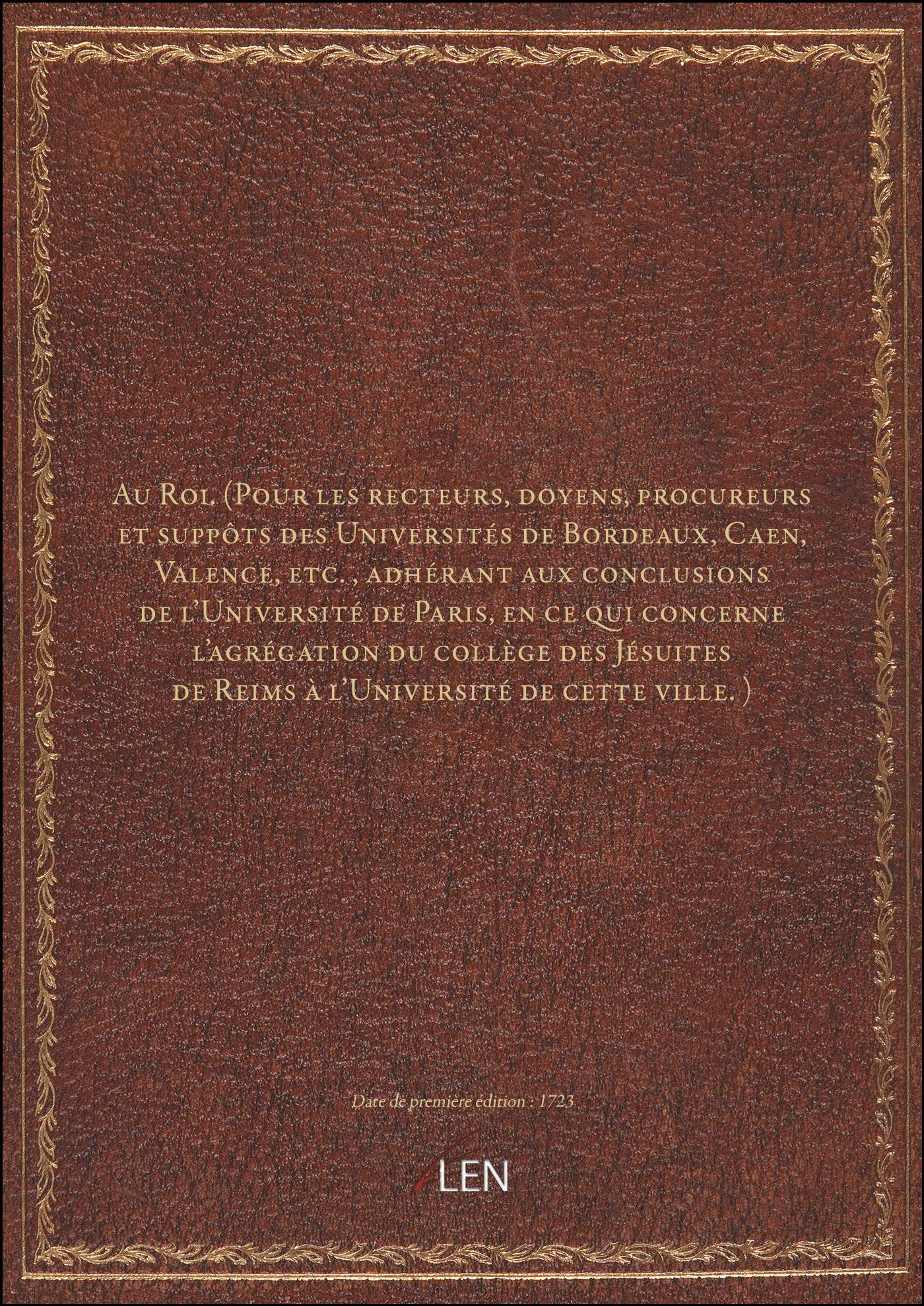 Au Roi. (Pour les recteurs, doyens, procureurs et suppôts des Universités de Bordeaux, Caen, Valence, etc., adhérant aux conclusions de l'Université de Paris, en ce qui concerne l'agrégation du collège des Jésuites de Reims à l'Université de cette ville.)