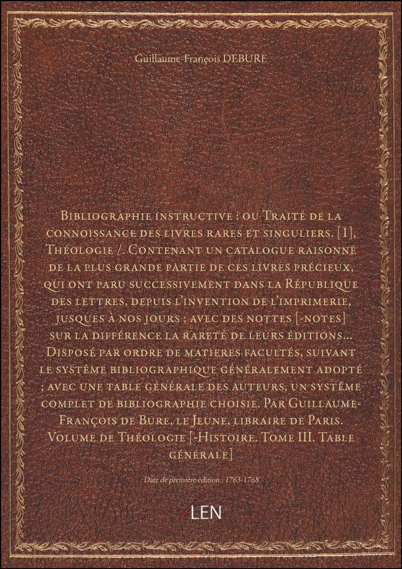 Titre complet : Bibliographie instructive : ou Traité de la connoissance des livres rares et singuliers. [1], Théologie / . Contenant un catalogue raisonné de la plus grande partie de ces livres précieux, qui ont paru successivement dans la République des lettres, depuis l'invention de l'imprimerie, jusques à nos jours ; avec des nottes [-notes] sur la différence la rareté de leurs éditions... Disposé par ordre de matieres facultés, suivant le systême bibliographique généralement adopté ; avec une table générale des auteurs, un systême complet de bibliographie choisie. Par Guillaume-François de Bure, le Jeune, libraire de Paris. Volume de Théologie [-Histoire. Tome III. Table générale]