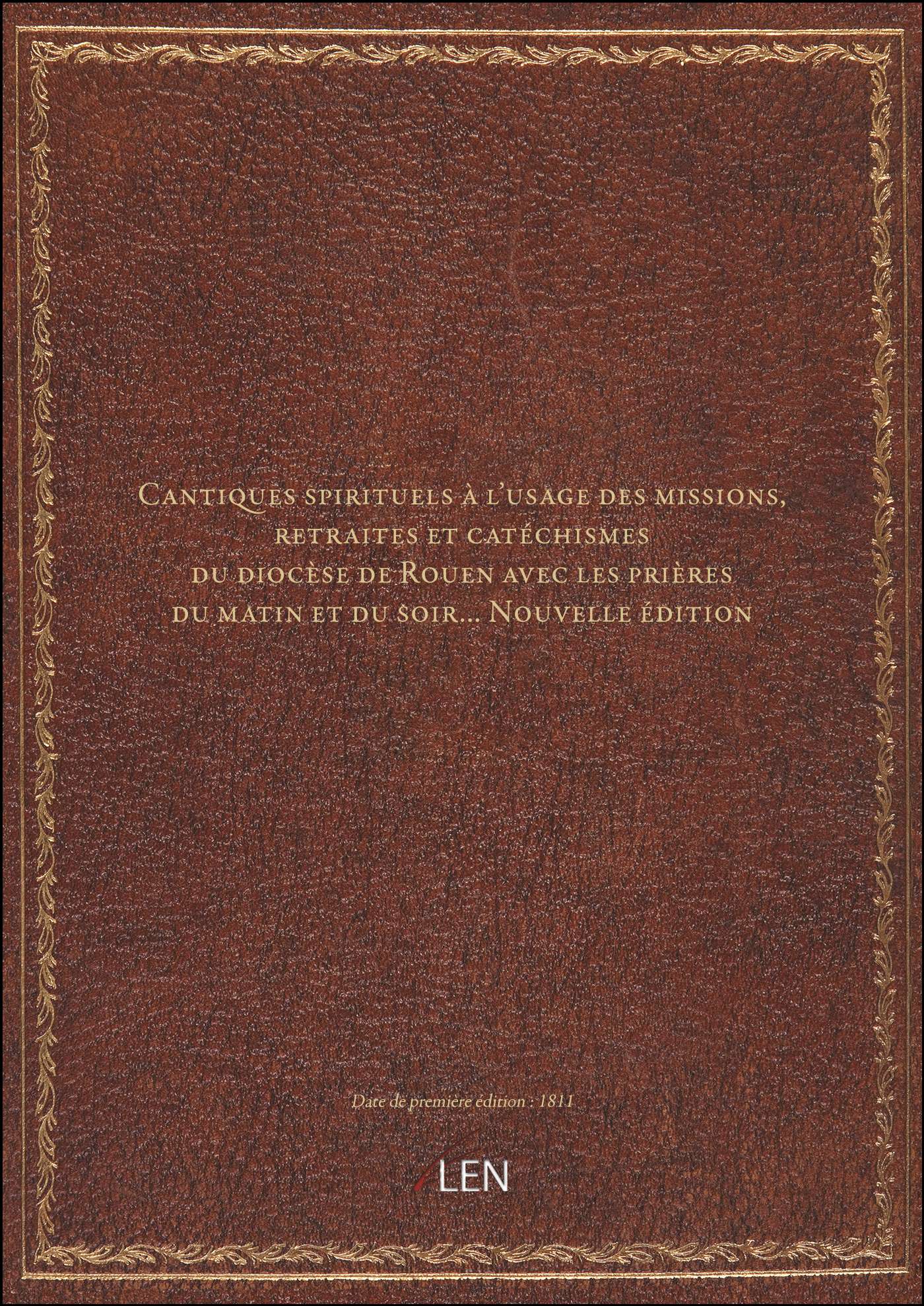 Titre complet : Cantiques spirituels à l'usage des missions, retraites et catéchismes du diocèse de Rouen avec les prières du matin et du soir... Nouvelle édition