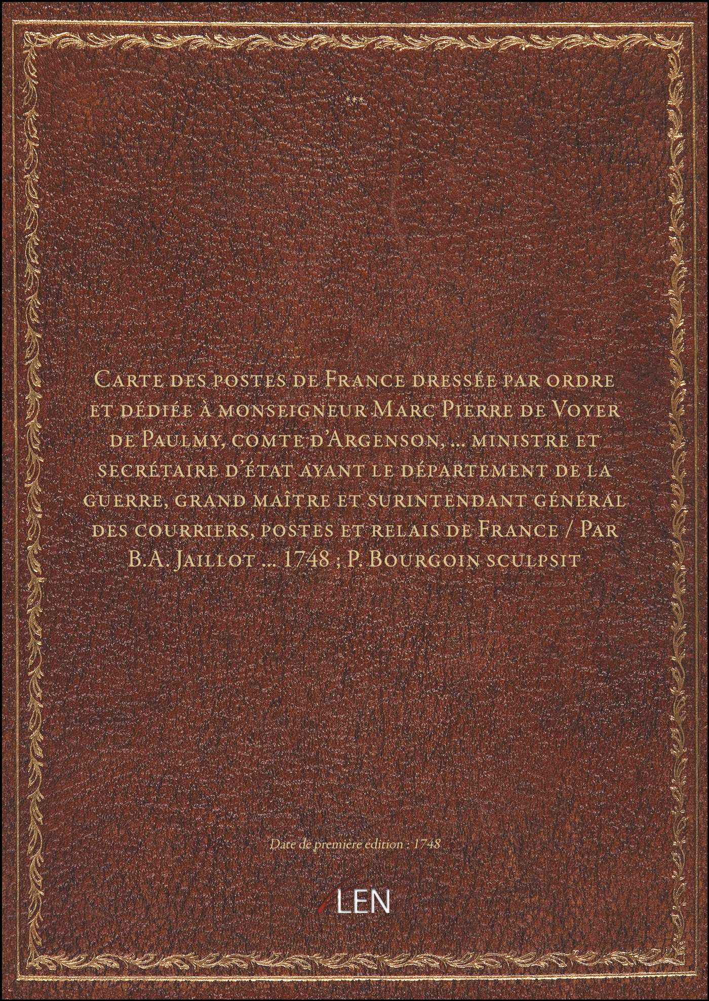 Titre complet : Carte des postes de France dressée par ordre et dédiée à monseigneur Marc Pierre de Voyer de Paulmy, comte d'Argenson, ... ministre et secrétaire d'état ayant le département de la guerre, grand maître et surintendant général des courriers, postes et relais de France / Par B.A. Jaillot ... 1748 ; P. Bourgoin sculpsit