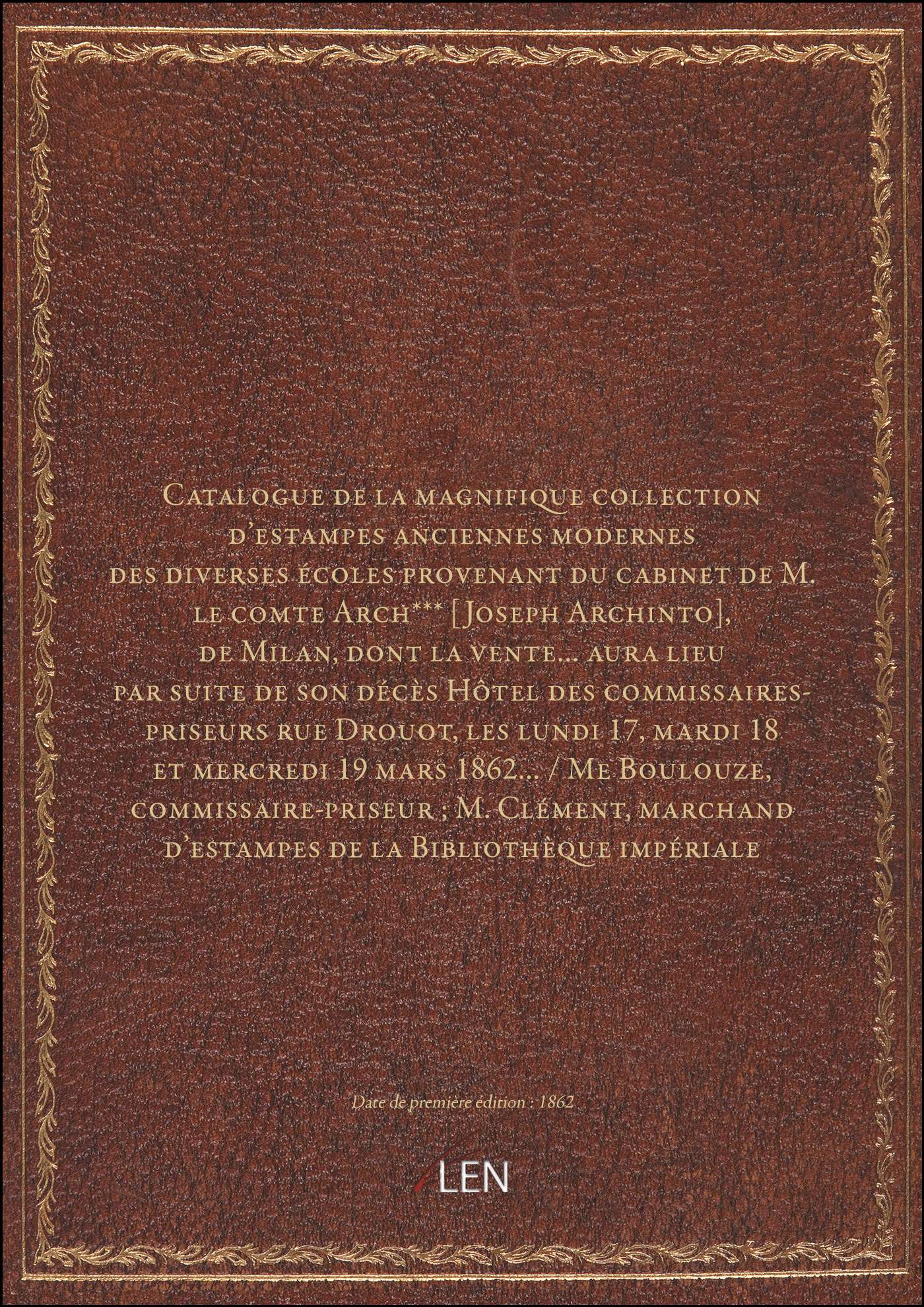 Titre complet : Catalogue de la magnifique collection d'estampes anciennes modernes des diverses écoles provenant du cabinet de M. le comte Arch*** [Joseph Archinto], de Milan, dont la vente... aura lieu par suite de son décès Hôtel des commissaires-priseurs rue Drouot, les lundi 17, mardi 18 et mercredi 19 mars 1862... / Me Boulouze, commissaire-priseur ; M. Clément, marchand d'estampes de la Bibliothèque impériale
