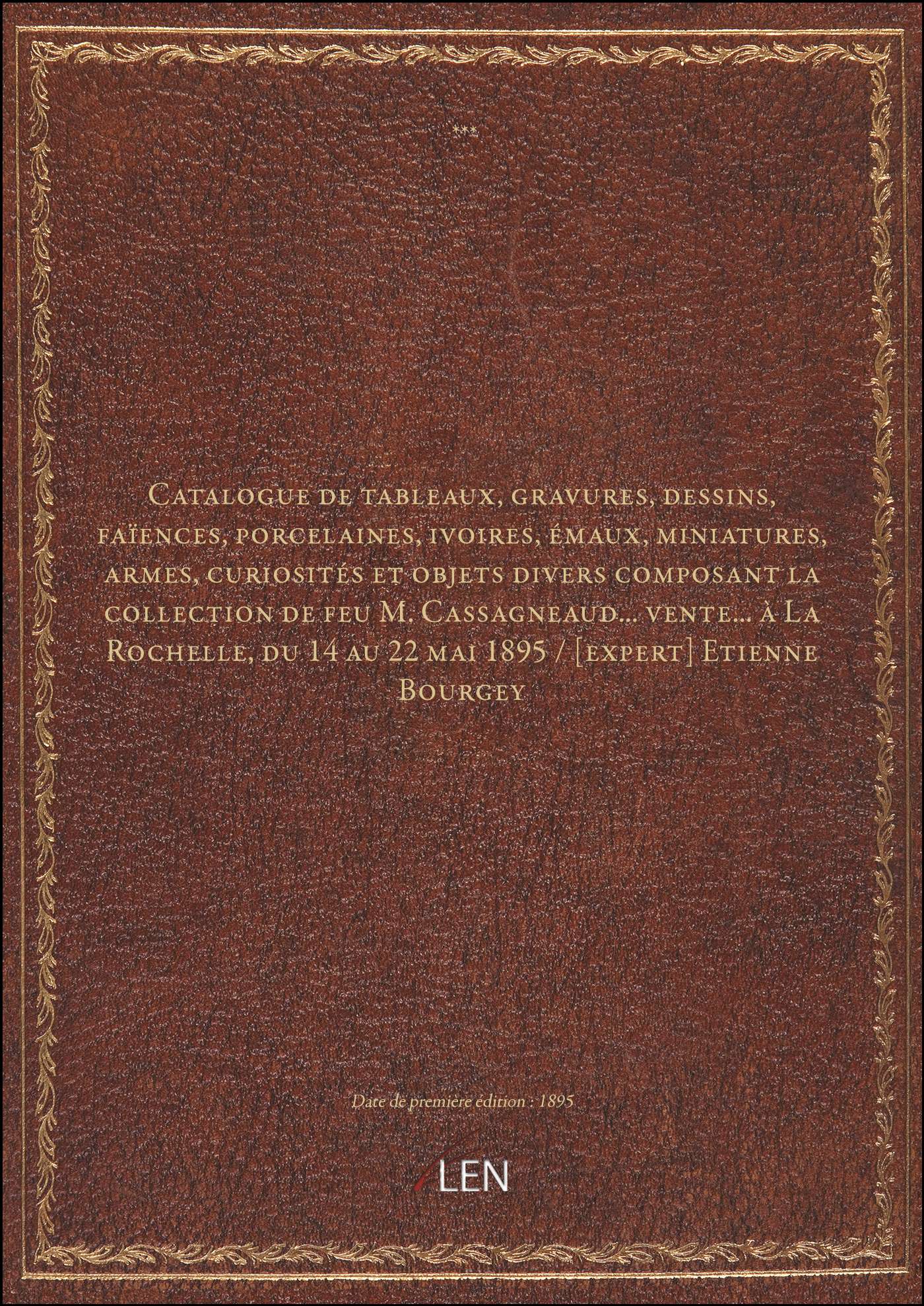 Titre complet : Catalogue de tableaux, gravures, dessins, faïences, porcelaines, ivoires, émaux, miniatures, armes, curiosités et objets divers composant la collection de feu M. Cassagneaud... vente... à La Rochelle, du 14 au 22 mai 1895 / [expert] Etienne Bourgey