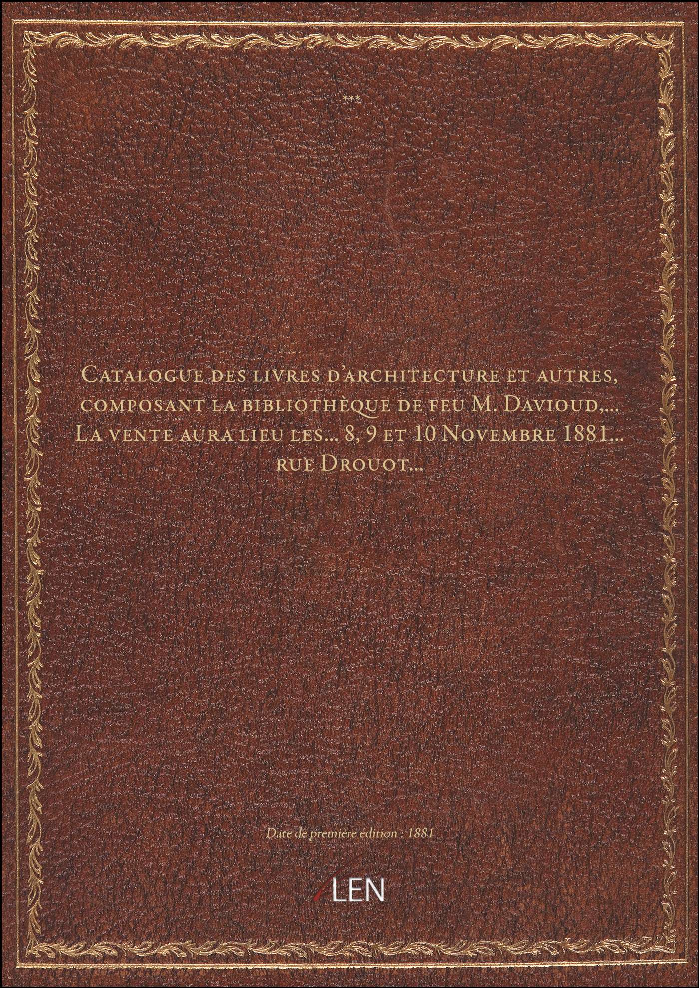 Titre complet : Catalogue des livres d'architecture et autres, composant la bibliothèque de feu M. Davioud,... La vente aura lieu les... 8, 9 et 10 Novembre 1881... rue Drouot...