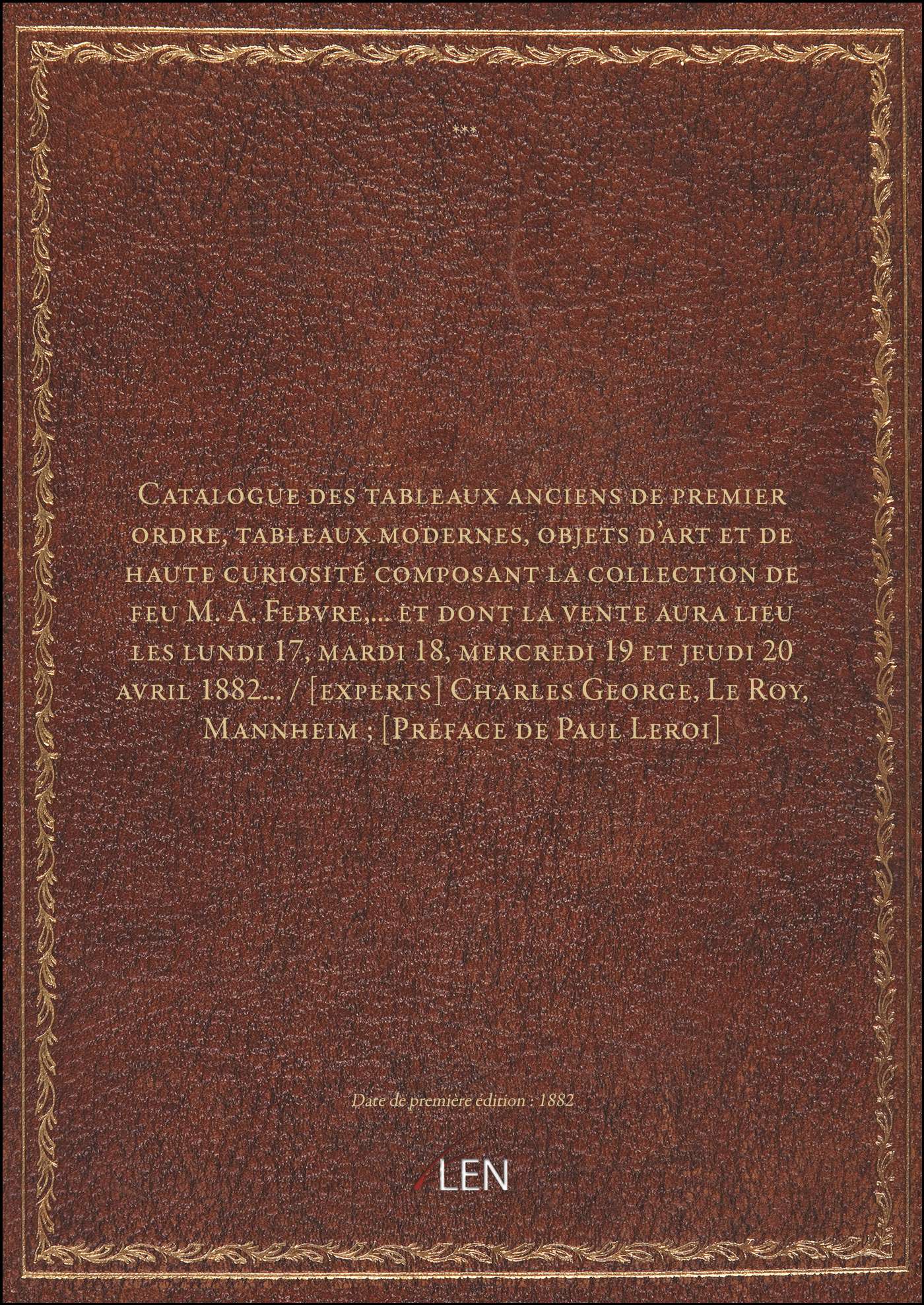Titre complet : Catalogue des tableaux anciens de premier ordre, tableaux modernes, objets d'art et de haute curiosité composant la collection de feu M. A. Febvre,... et dont la vente aura lieu les lundi 17, mardi 18, mercredi 19 et jeudi 20 avril 1882... / [experts] Charles George, Le Roy, Mannheim ; [Préface de Paul Leroi]