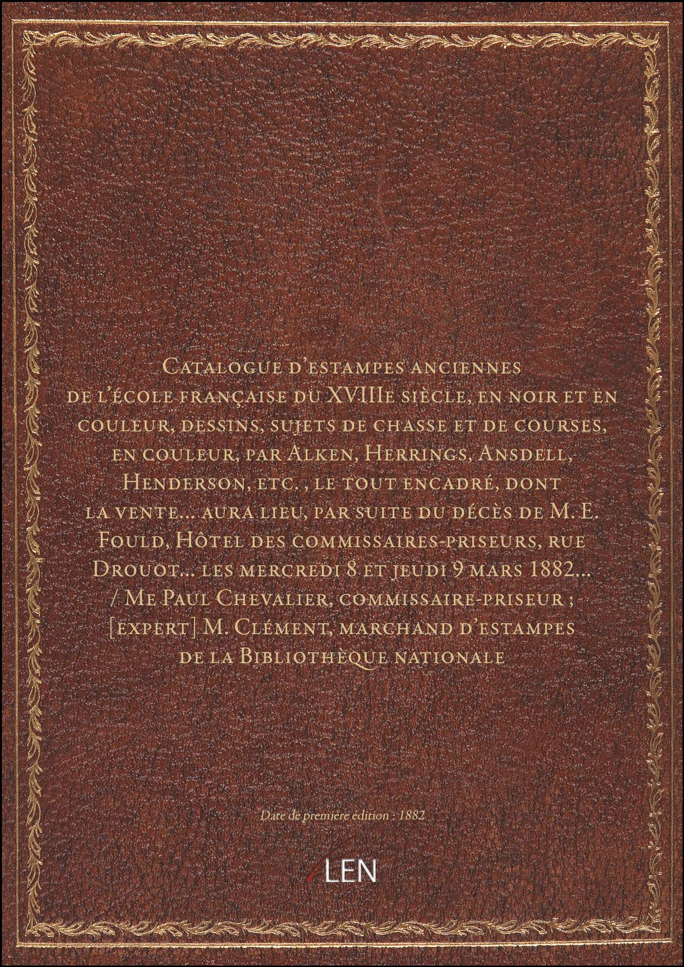 Titre complet : Catalogue d'estampes anciennes de l'école française du XVIIIe siècle, en noir et en couleur, dessins, sujets de chasse et de courses, en couleur, par Alken, Herrings, Ansdell, Henderson, etc., le tout encadré, dont la vente... aura lieu, par suite du décès de M. E. Fould, Hôtel des commissaires-priseurs, rue Drouot... les mercredi 8 et jeudi 9 mars 1882... / Me Paul Chevalier, commissaire-priseur ; [expert] M. Clément, marchand d'estampes de la Bibliothèque nationale