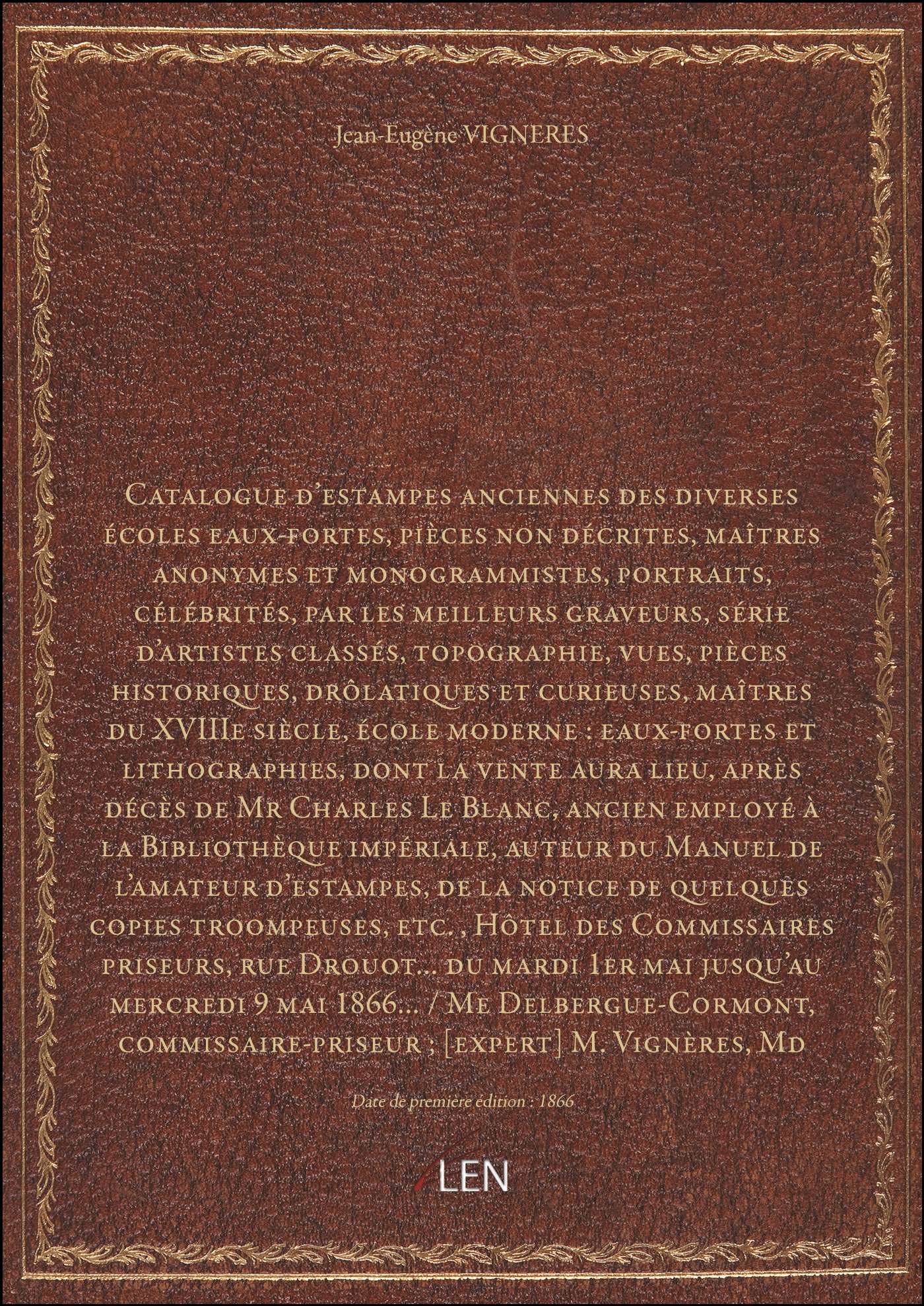 Titre complet : Catalogue d'estampes anciennes des diverses écoles eaux-fortes, pièces non décrites, maîtres anonymes et monogrammistes, portraits, célébrités, par les meilleurs graveurs, série d'artistes classés, topographie, vues, pièces historiques, drôlatiques et curieuses, maîtres du XVIIIe siècle, école moderne : eaux-fortes et lithographies, dont la vente aura lieu, après décès de Mr Charles Le Blanc, ancien employé à la Bibliothèque impériale, auteur du Manuel de l'amateur d'estampes, de la notice de quelques copies troompeuses, etc., Hôtel des Commissaires priseurs, rue Drouot... du mardi 1er mai jusqu'au mercredi 9 mai 1866... / Me Delbergue-Cormont, commissaire-priseur ; [expert] M. Vignères, Md d'estampes