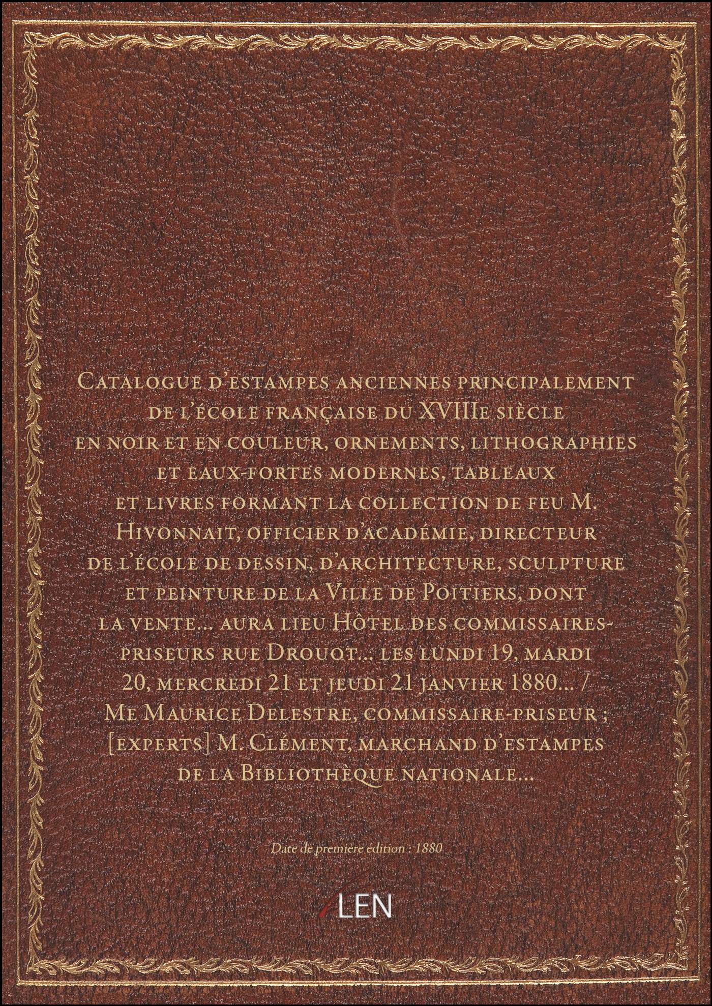 Titre complet : Catalogue d'estampes anciennes principalement de l'école française du XVIIIe siècle en noir et en couleur, ornements, lithographies et eaux-fortes modernes, tableaux et livres formant la collection de feu M. Hivonnait, officier d'académie, directeur de l'école de dessin, d'architecture, sculpture et peinture de la Ville de Poitiers, dont la vente... aura lieu Hôtel des commissaires-priseurs rue Drouot... les lundi 19, mardi 20, mercredi 21 et jeudi 21 janvier 1880... / Me Maurice Delestre, commissaire-priseur ; [experts] M. Clément, marchand d'estampes de la Bibliothèque nationale...