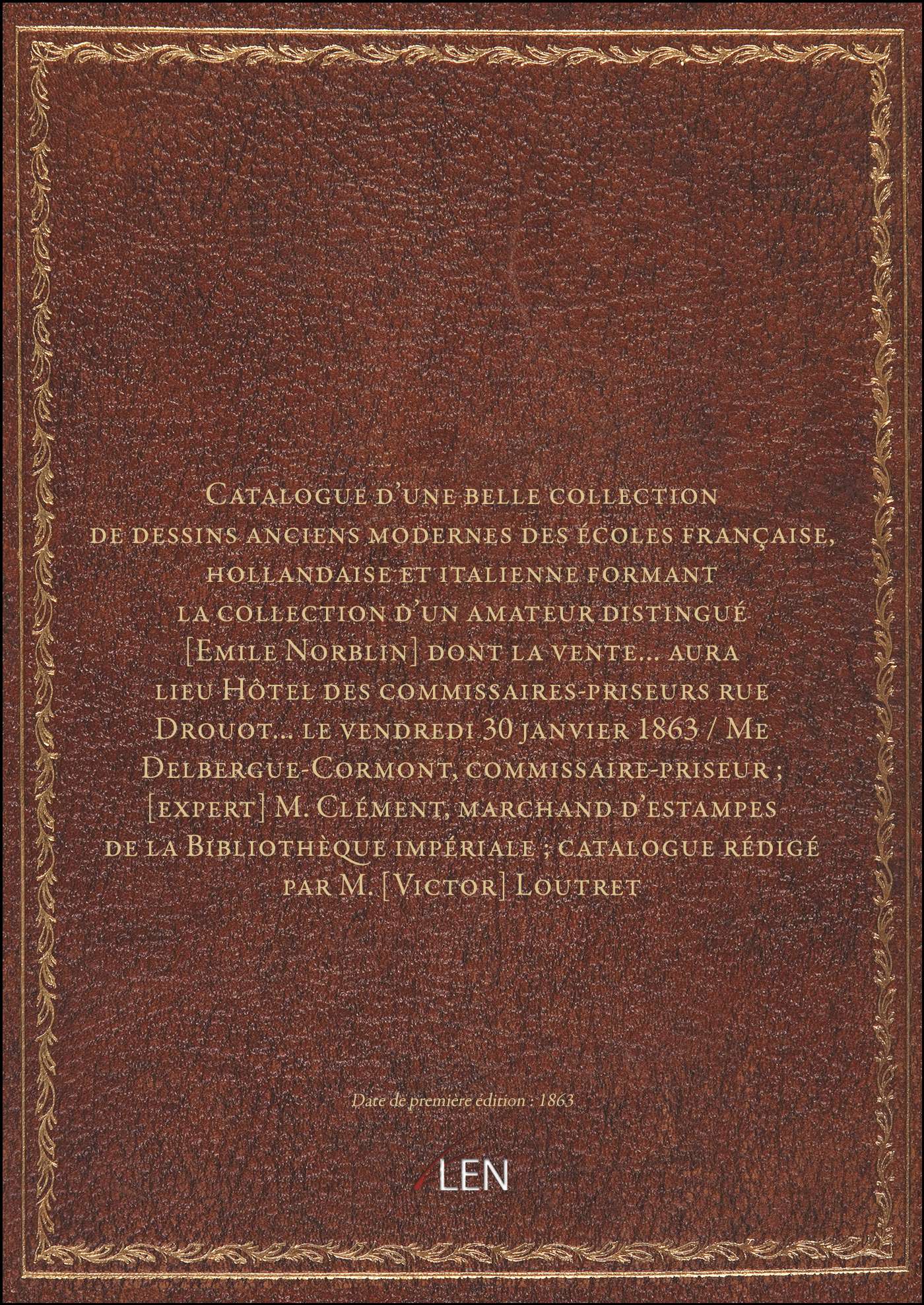 Titre complet : Catalogue d'une belle collection de dessins anciens modernes des écoles française, hollandaise et italienne formant la collection d'un amateur distingué [Emile Norblin] dont la vente... aura lieu Hôtel des commissaires-priseurs rue Drouot... le vendredi 30 janvier 1863 / Me Delbergue-Cormont, commissaire-priseur ; [expert] M. Clément, marchand d'estampes de la Bibliothèque impériale ; catalogue rédigé par M. [Victor] Loutret