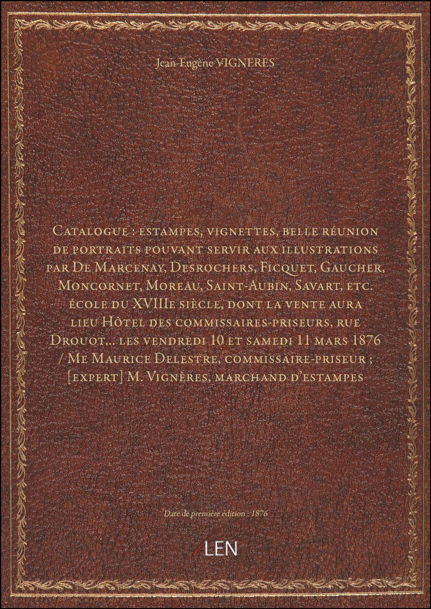 Titre complet : Catalogue : estampes, vignettes, belle réunion de portraits pouvant servir aux illustrations par De Marcenay, Desrochers, Ficquet, Gaucher, Moncornet, Moreau, Saint-Aubin, Savart, etc. école du XVIIIe siècle, dont la vente aura lieu Hôtel des commissaires-priseurs, rue Drouot... les vendredi 10 et samedi 11 mars 1876 / Me Maurice Delestre, commissaire-priseur ; [expert] M. Vignères, marchand d'estampes
